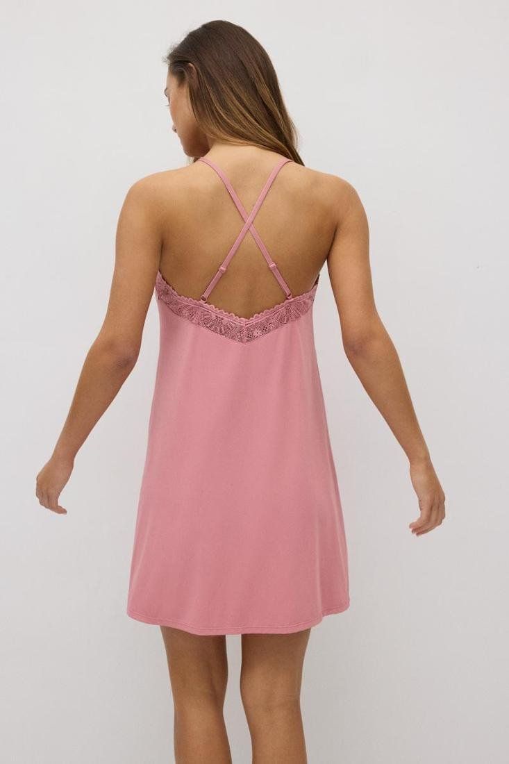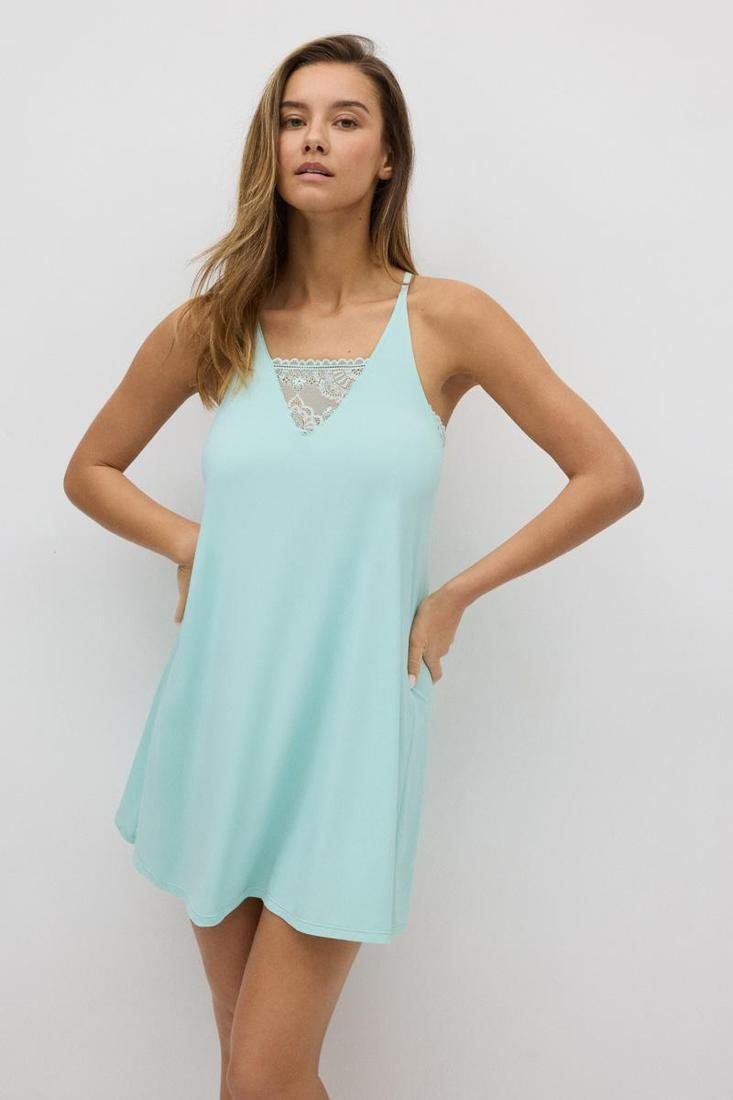 Camisón de tirantes con detalles de encaje que aporta un estilo sensual al look. Tejido suave y de gran confort.