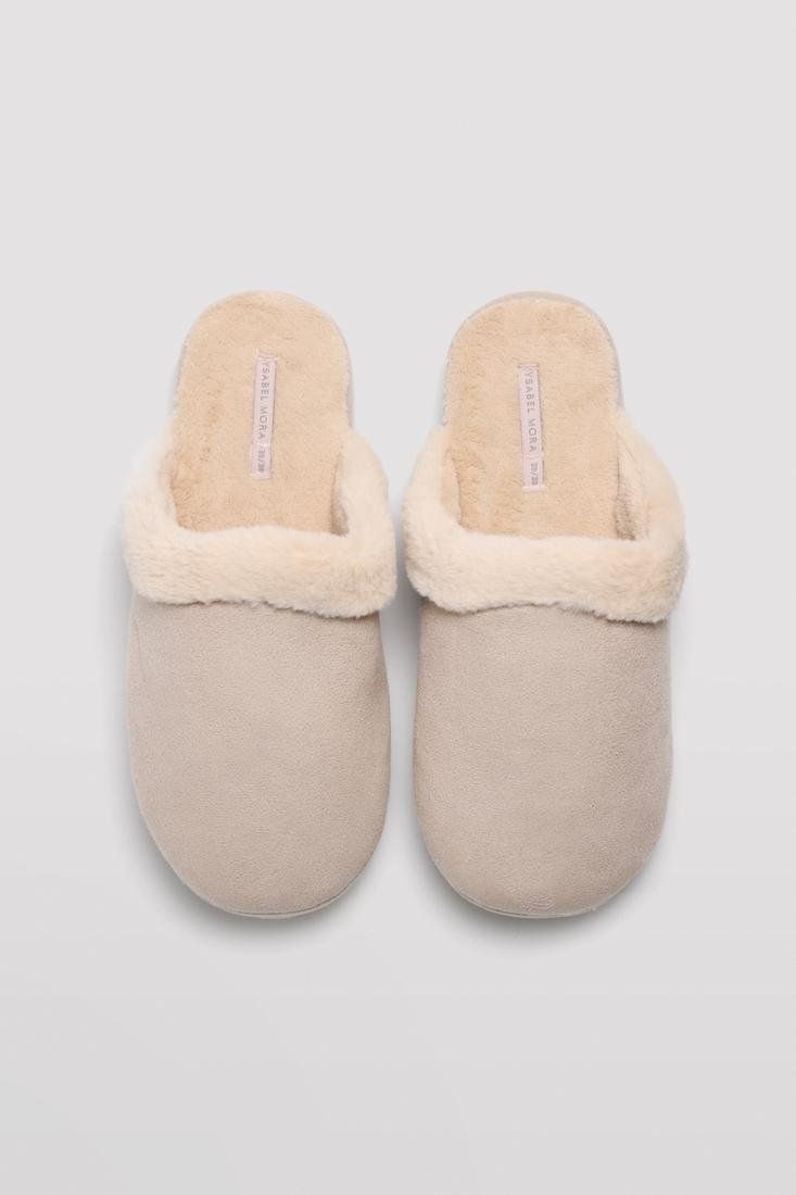 Zapatillas de casa para mujer destalonadas y con suela blanda. Detalle de pelo rizado y estampado liso. Interior cálido y acogedor.