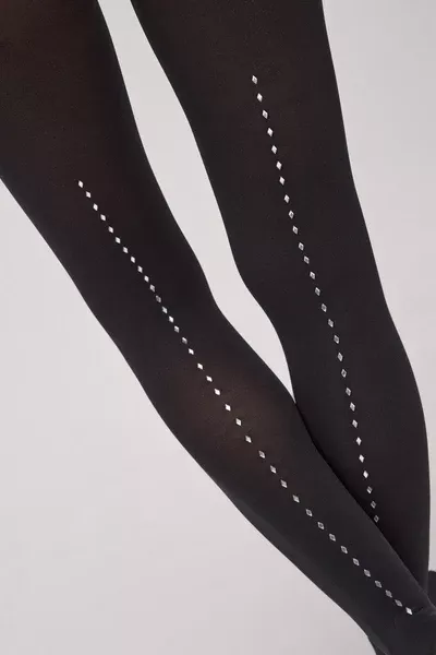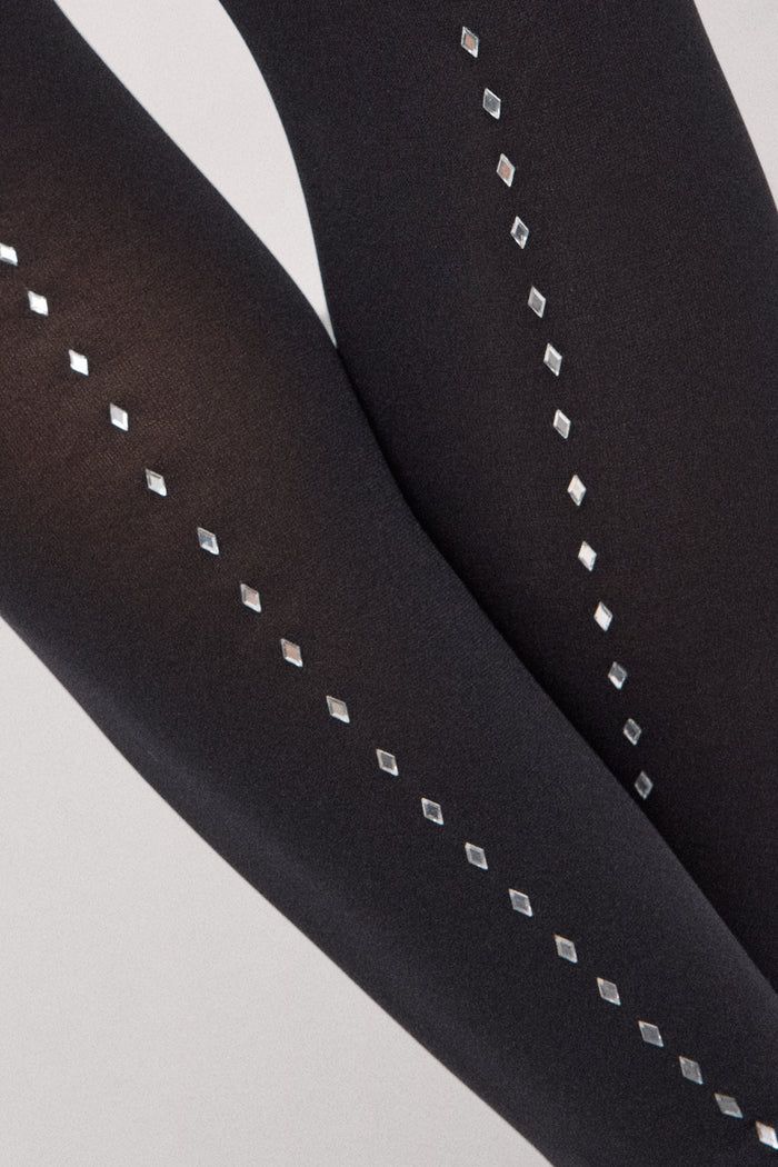 Panty de 20 deniers de color negro con detalle lineal trasero de brillos en vertical tipo diamante.