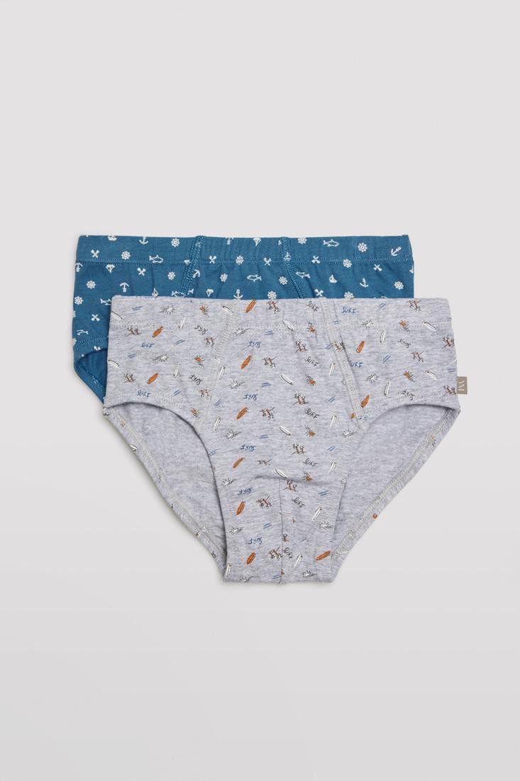Surf camp. Pack de 2 calzoncillos slip para niños, confeccionado en 100% algodón, lo que asegura una gran comodidad y suavidad para la piel del niño. El pack incluye una prenda en color gris y otra en azul. Los calzoncillos slip tienen un ajuste ceñido y cómodo, lo que asegura que el niño se sienta cómodo y seguro mientras los usa. La cintura elástica proporciona un ajuste seguro y cómodo, los calzoncillos no se caerán ni se moverán incómodamente mientras el niño está jugando o haciendo ejercicio. ¡Practicidad y comodidad!