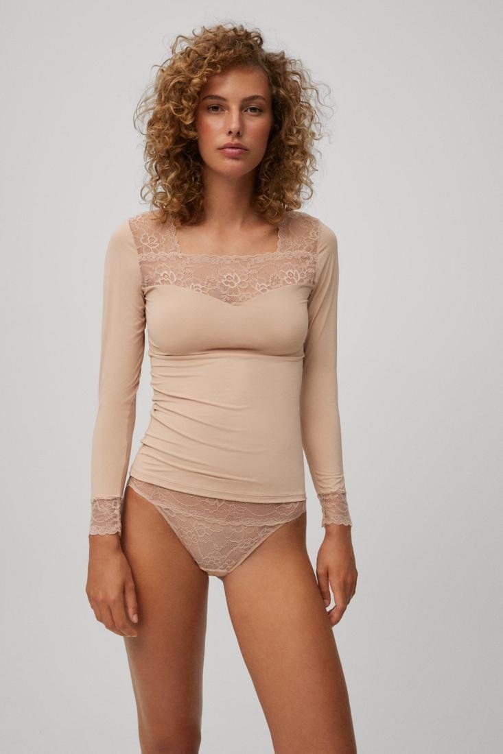 Colección Daily lace, ligero encaje para diario. Camiseta manga larga con encaje en el cuello y detalle en las mangas. Diseño de cuello cuadrado, elegante y sencillo. Perfecta para el día a día.