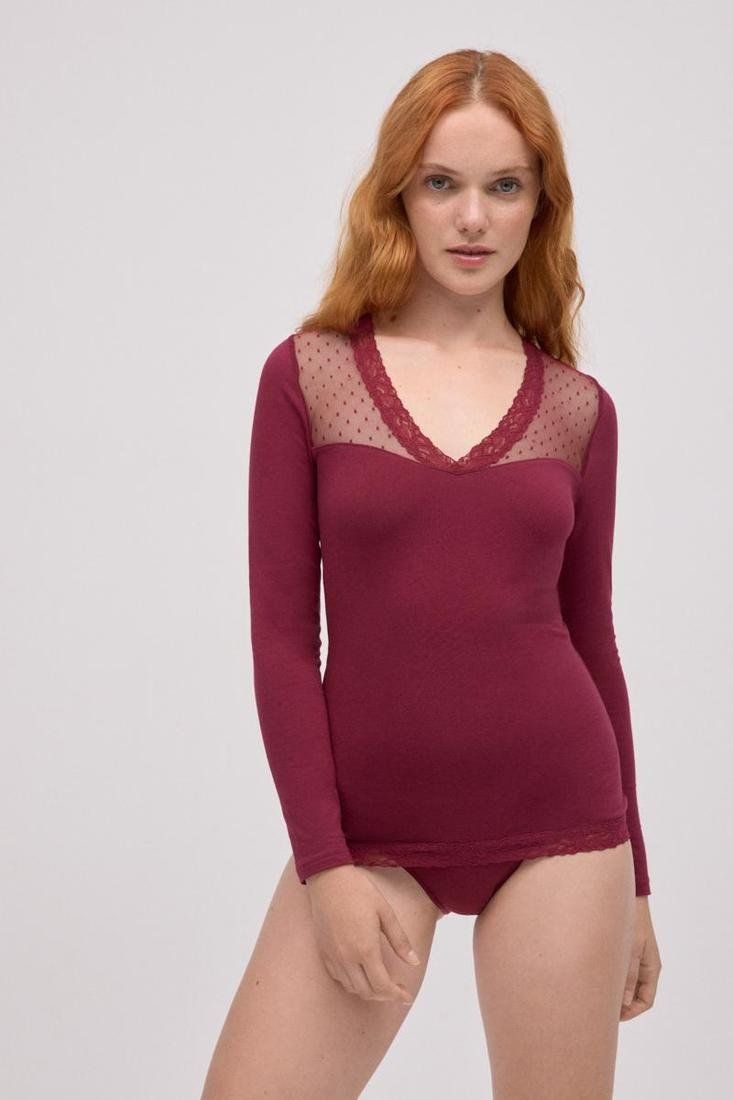 Camiseta manga larga con detalles de encaje y plumeti. Camiseta hecha con algodón natural.