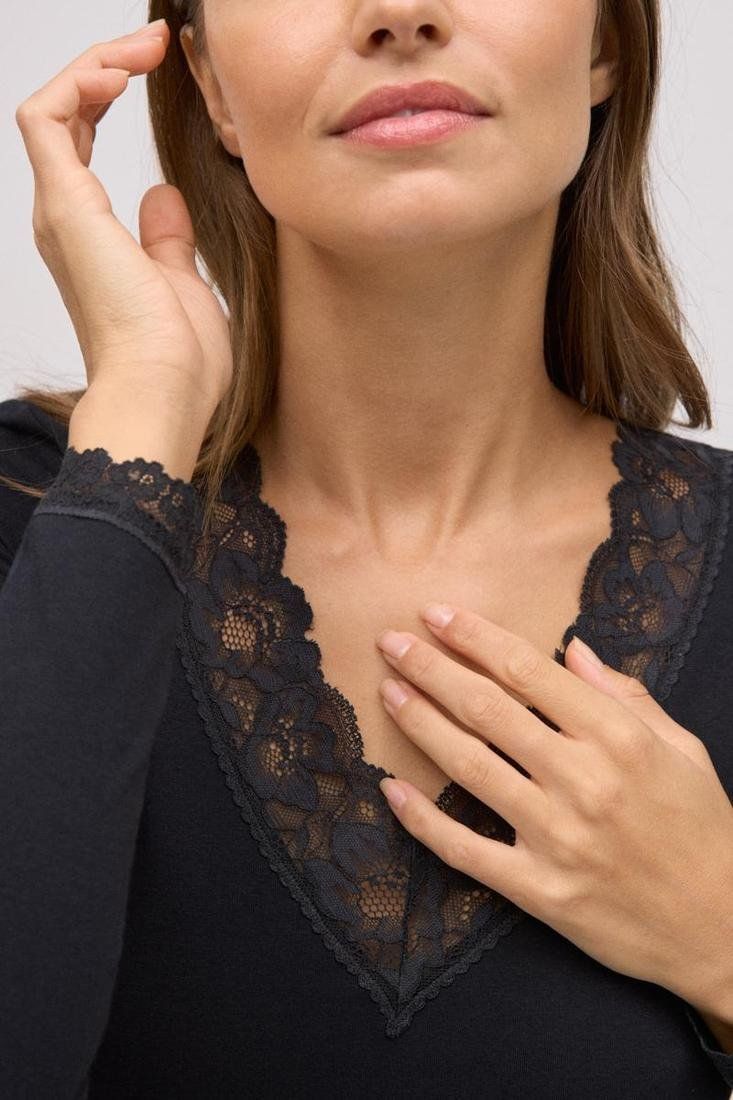 Camiseta manga larga de algodón natural con detalle de encaje en el escote y los puños de las mangas
