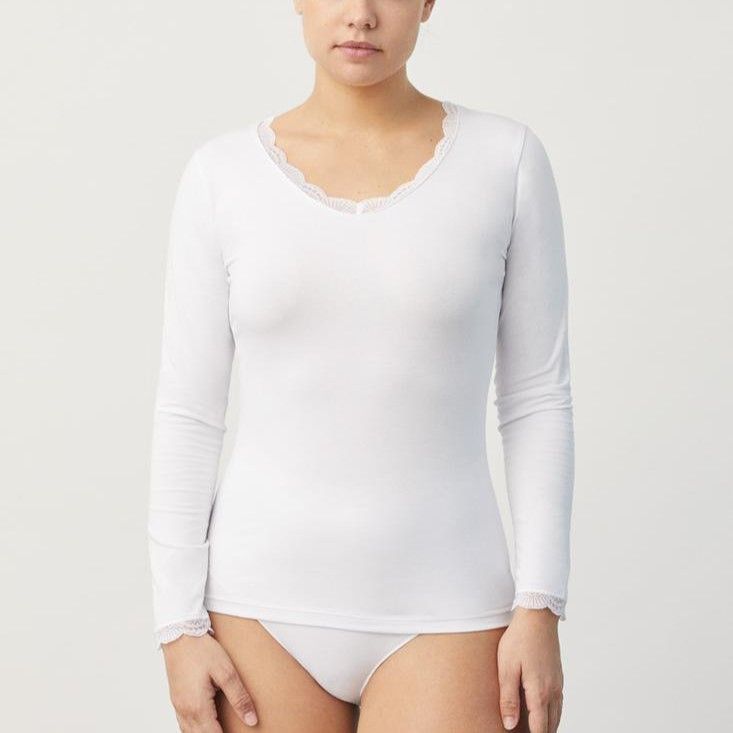 amiseta de manga larga y escote redondo en tejido Cotton Nature. Las fibras naturales de este material aportan un extra de suavidad a la prenda. Sus acabados con costuras planas invisibles evitan las marcas y favorecen una mayor adaptabilidad y un ajuste ergonómico perfecto. Modelo básico de gran confort pensado para el día a día. Decoradas con blonda. Confeccionadas con material antialergénico.