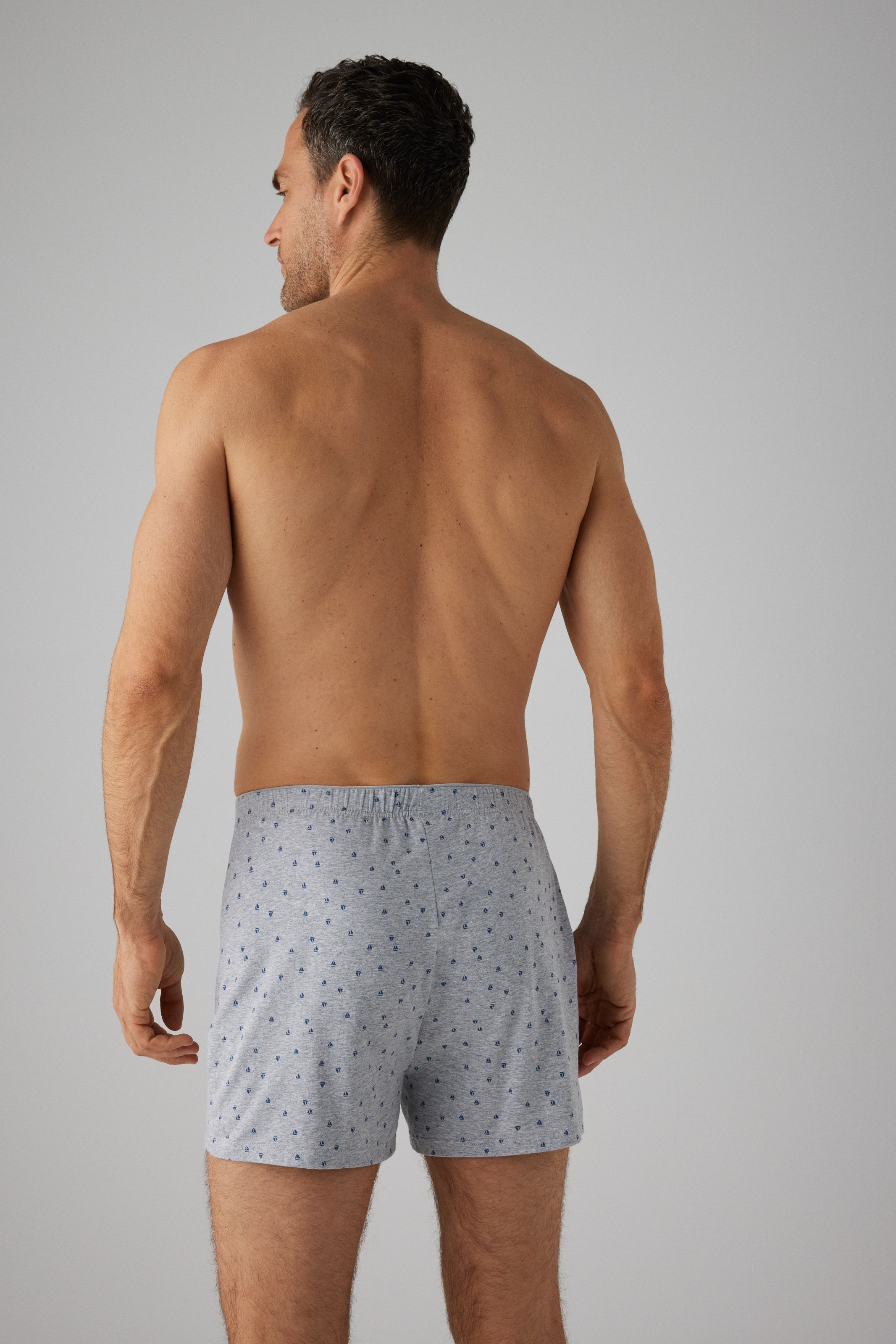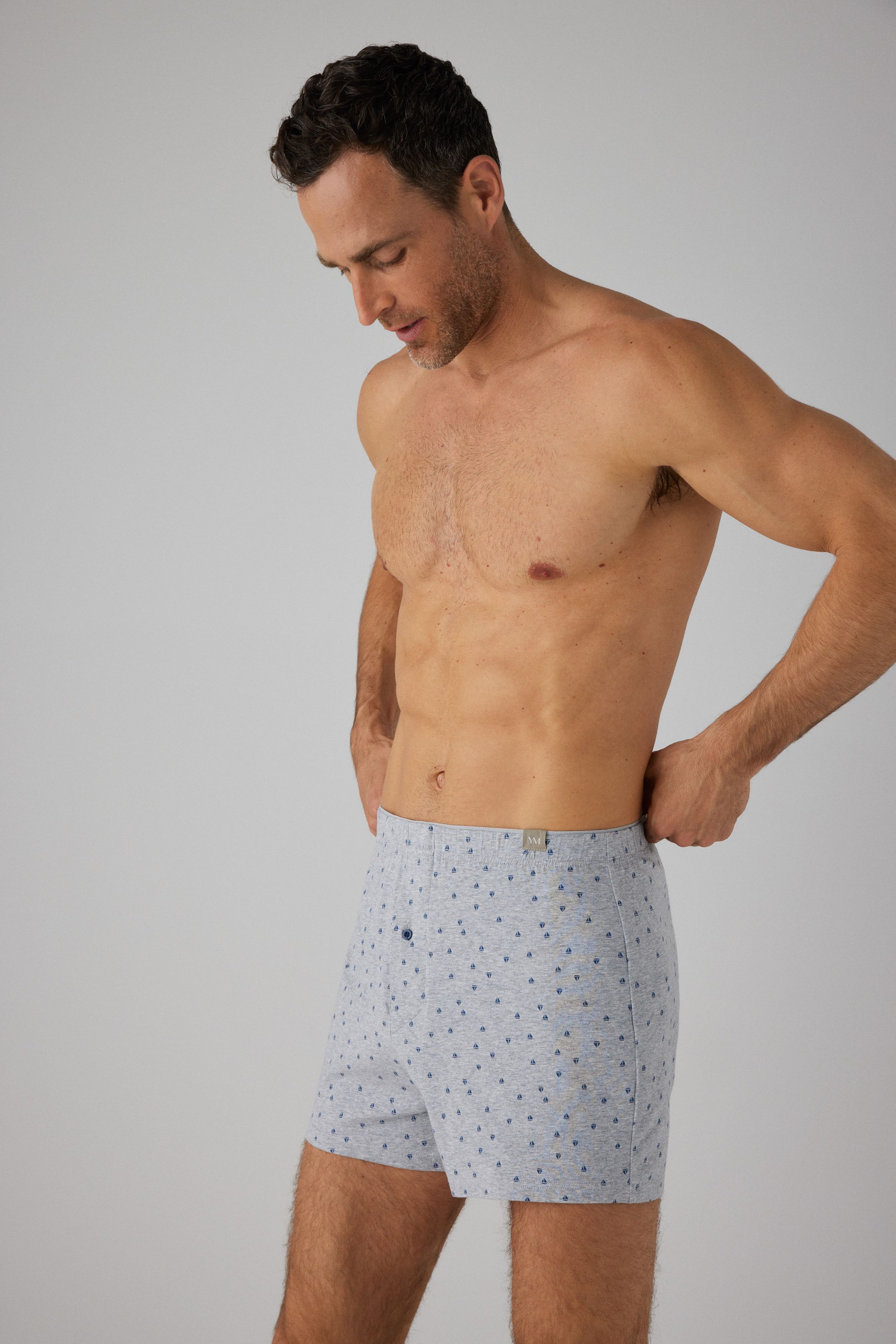 Bóxer con abertura. Prenda de ropa interior masculina confeccionada con algodón natural, lo que proporciona una sensación suave y cómoda al contacto con la piel. Este calzoncillo bóxer está diseñado en color gris y cuenta con un estampado de barquitos de vela. Además, este calzoncillo bóxer tiene una abertura frontal que proporciona mayor comodidad y facilidad de uso en comparación con los bóxers sin abertura. El diseño bóxer cubre una mayor parte del muslo, proporcionando mayor comodidad y libertad de movimiento. La banda elástica en la cintura es suave y ajustable, asegurando un ajuste cómodo y sin irritaciones en la piel. ¡Única y divertida!