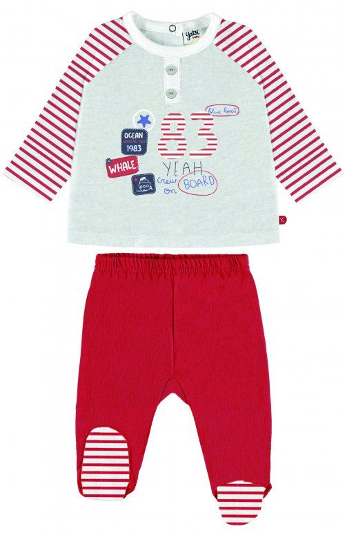 Conjunto bebe compuesto de camiseta manga larga y polaina todo en algodón y estampados a juego.