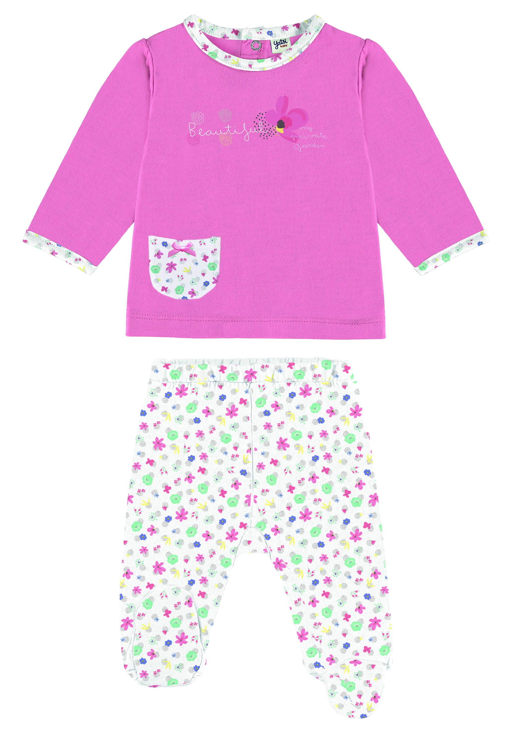 Conjunto bebe compuesto de camiseta manga larga y polaina todo en algodón y estampados a juego.