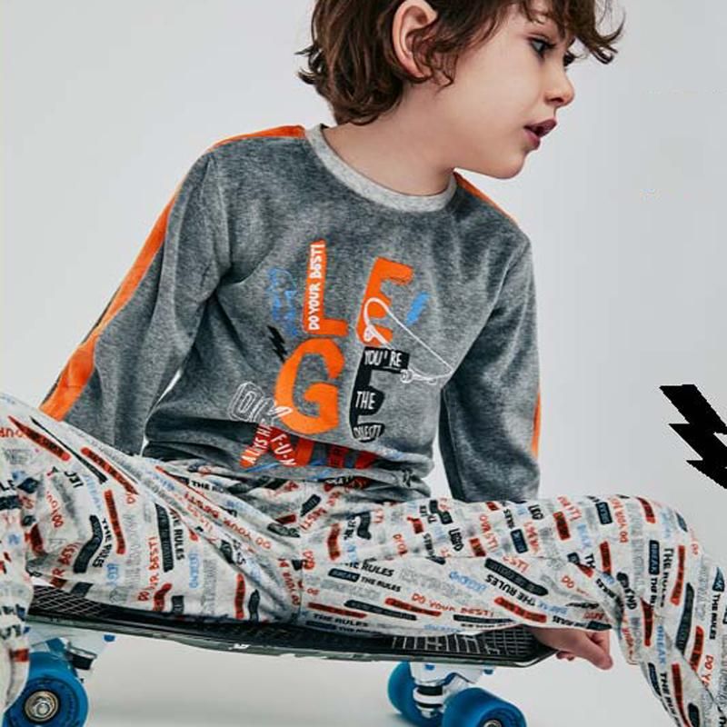 Llamativo pijama confeccionado en terciopelo de muy alta calidad, la camiseta es de color gris con con puños y cuello a contraste, destaca por su dibujo que ocupa toda la parte delantera con motivos de skates, además lleva unas bandas en color naranja en las mangas, se completa con pantalón con puños estampado por toda la superficie y fondo en color gris clarito. Pensado para niños que usan desde la talla 2 años hasta 6 años. Viene presentado en caja para regalo.