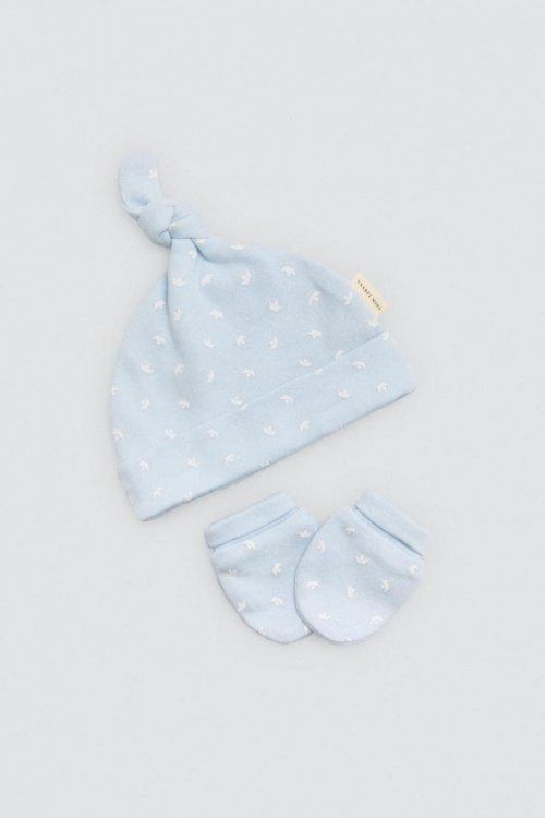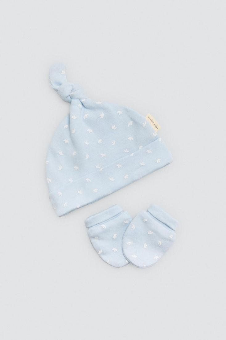Pack de bebé para la primera puesta de un recién nacido de algodón natural. El conjunto incluye cuatro piezas esenciales: una camiseta de manga larga, polaina, gorro y manoplas.