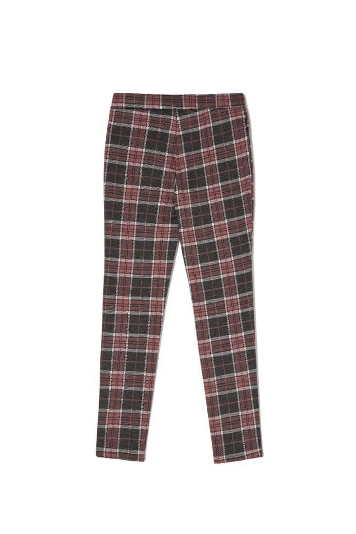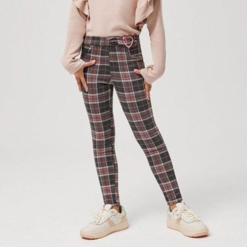 Leggings de cuadros para niña. Tejido elástico jacquard de cuadros, de ajuste perfecto y cómodo. Incorpora falso cinturón con broche en forma de corazón que le da un toque que enamora y y cinturilla elástica regulable con botón para mejor ajuste de talla.