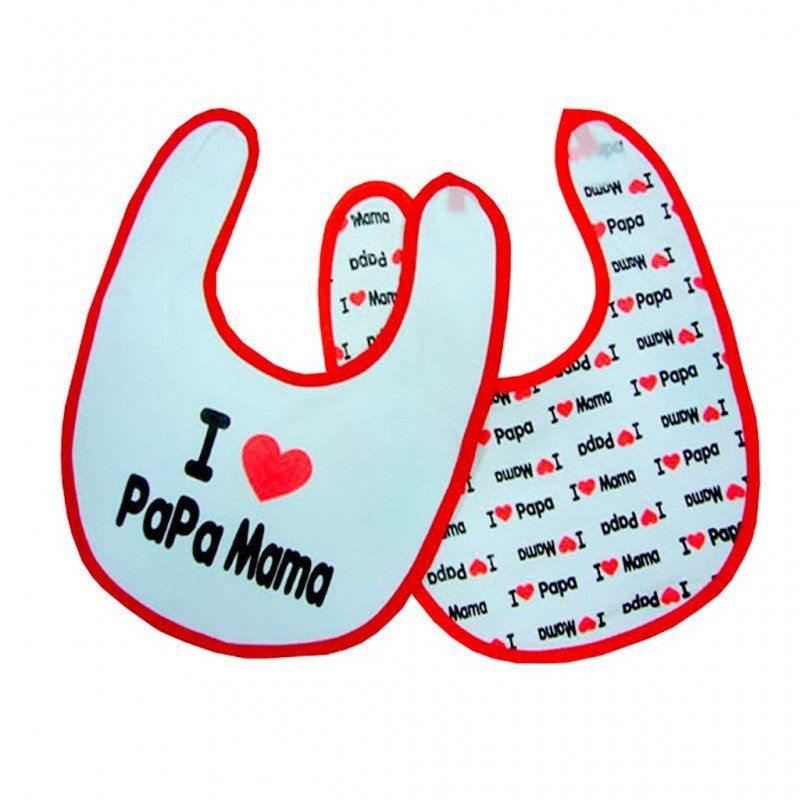 Babero de bebe "I love papa mama" en tejido de algodón estampado, con el interior de plástico y abrochado por velcro. Medida de 22x26 cm. Presentado en bolsa con percha.