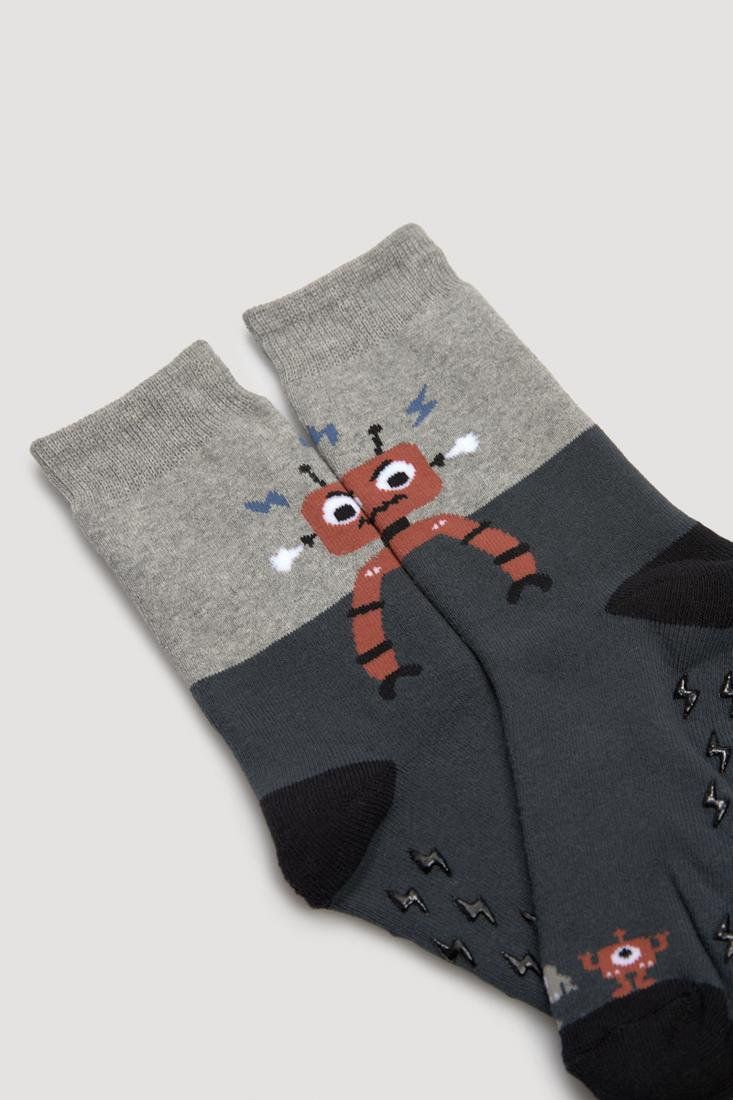 Calcetín térmico de niño antideslizante. Diseños robóticos sobre colores oscuros. Tejidos en algodón. Su interior térmico los convierten en el accesorio perfecto para los días más fríos. Diseños cómodos y de tendencia. Con detalle de rayos en el antideslizante.