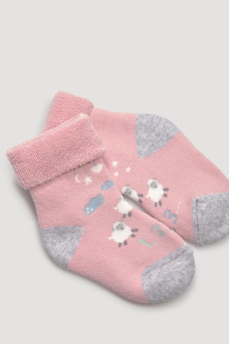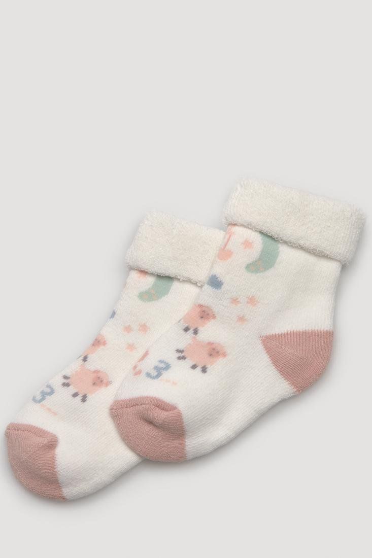 Pack de 2 calcetines para bebé tejidos en algodón. Diseños florales y de animales con colores suaves con puño especial antipresión.