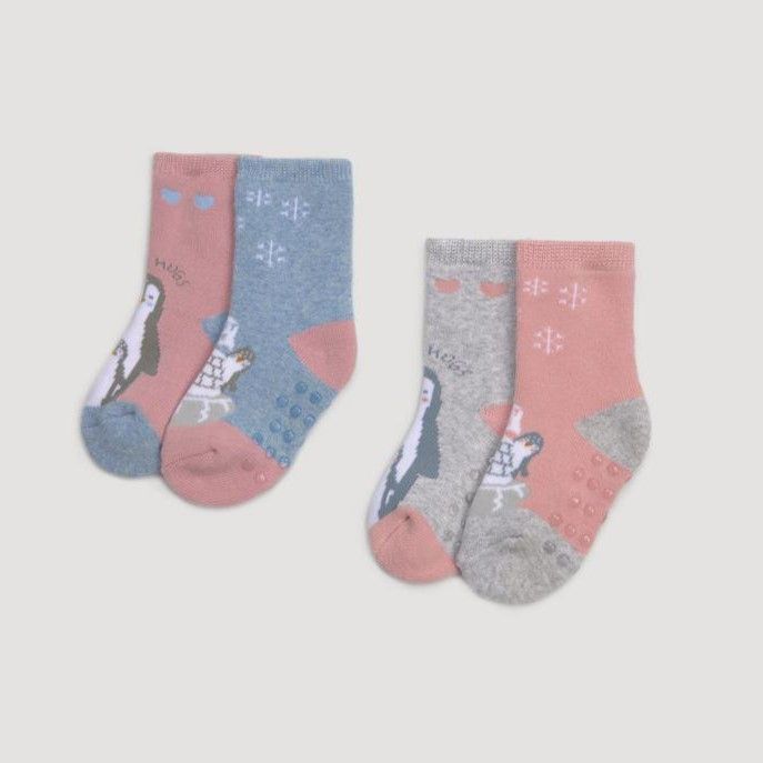 Pack de 2 calcetines térmicos antideslizantes para bebé tejidos en algodón. Diseños invernales con pingüinos en colores suaves con puño especial antipresión.