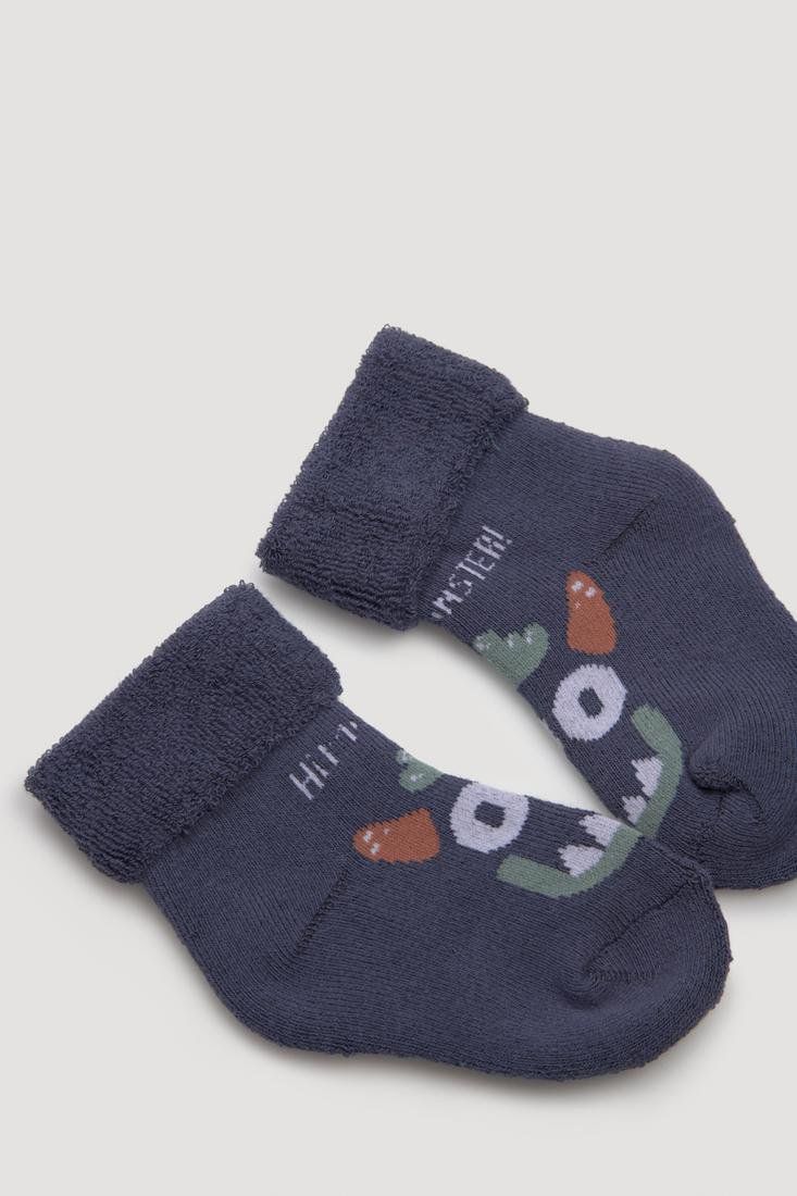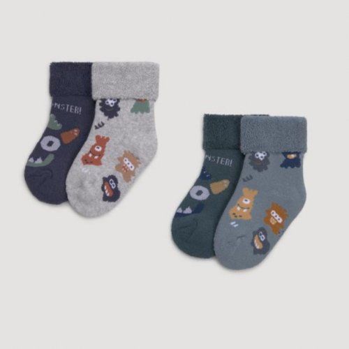 Pack de 2 calcetines térmicos para bebé tejidos en algodón con interior de rizo. Diseños de mounstruos que asustan de colores azul marino y gris.
