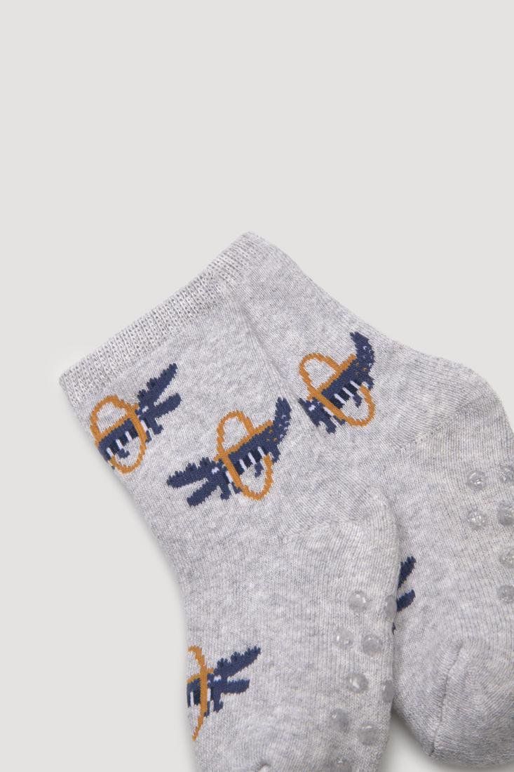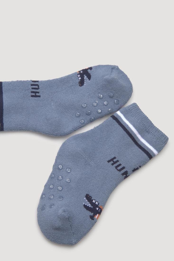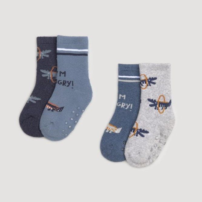 Pack de 2 calcetines térmicos antideslizantes para bebé tejidos en algodón. Diseños de cocodrilos hambrientos de colores azul y gris.