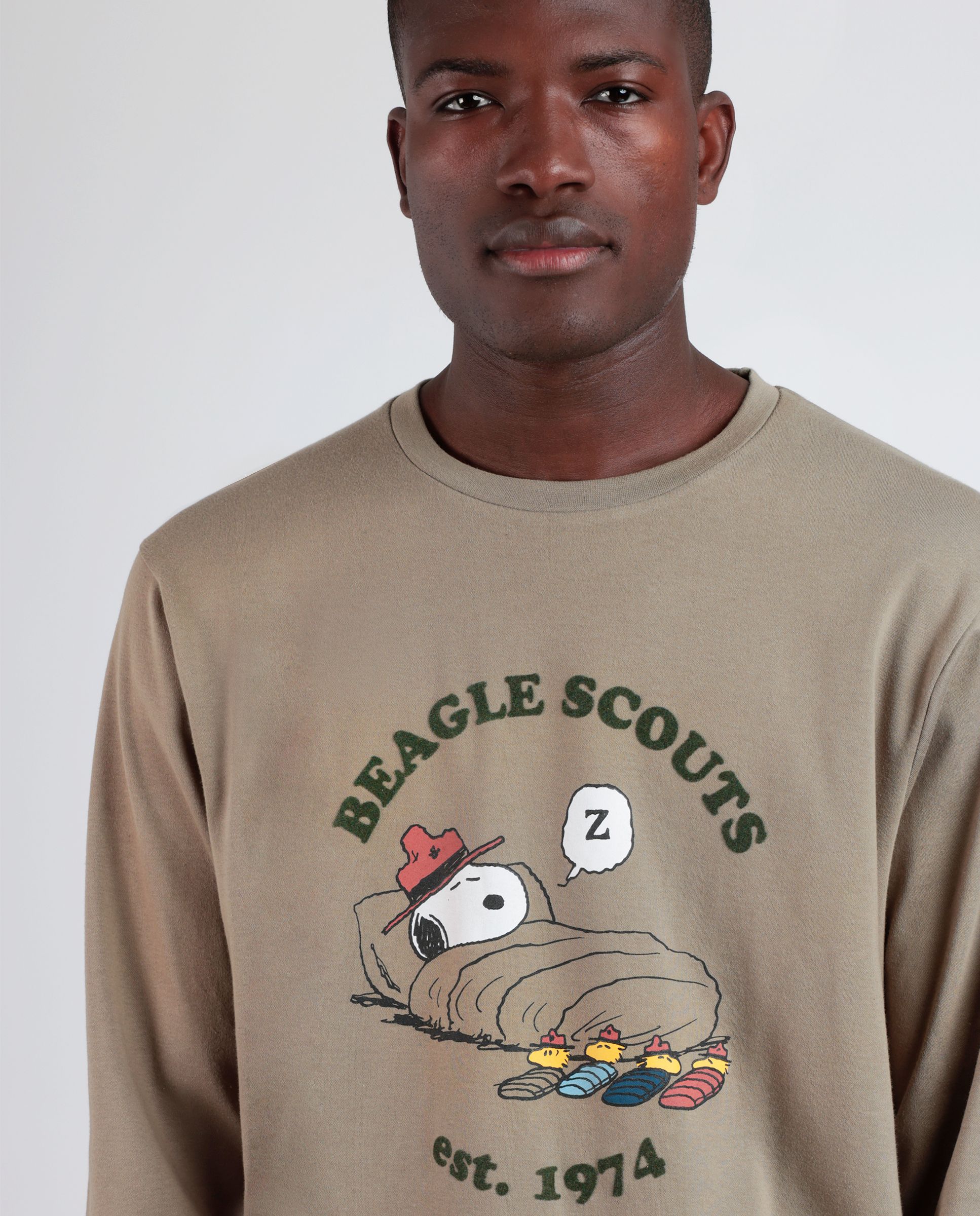 Pijama de hombre snoopy 100% algodón con pantalon con snoopys pequeños y camiseta lisa con dibujo de snoopy aventurero grande.
