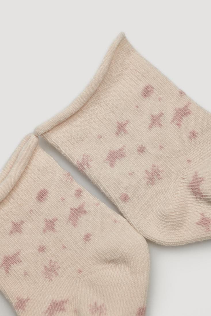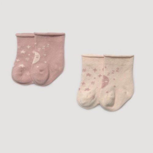 Pack de 2 calcetines para bebé tejidos en algodón. Diseños planetarios en colores suaves con puño especial antipresión. Remallados a mano.