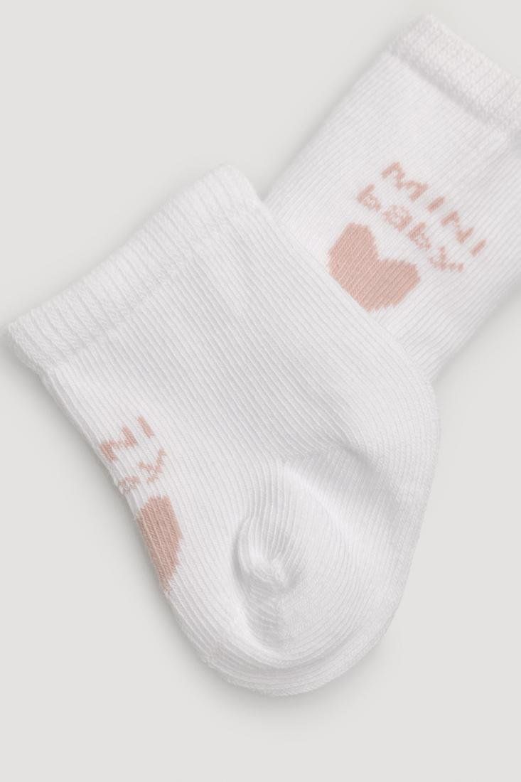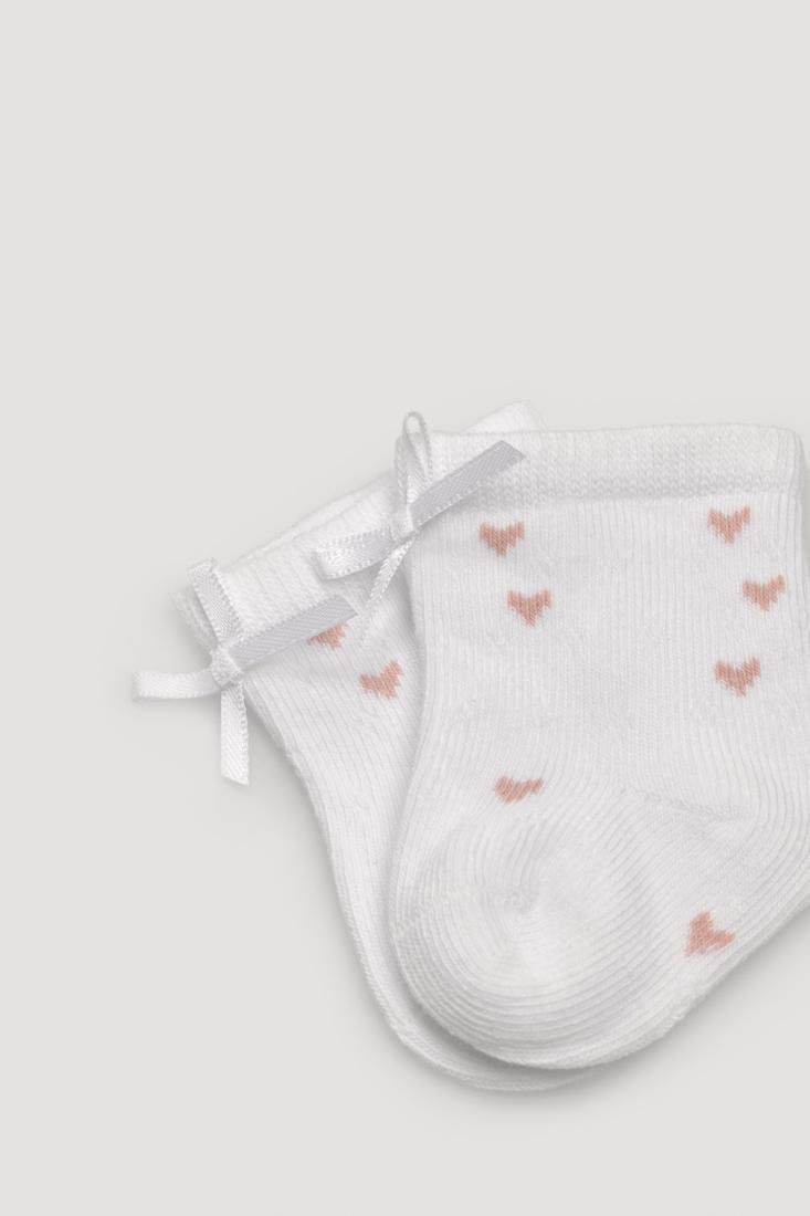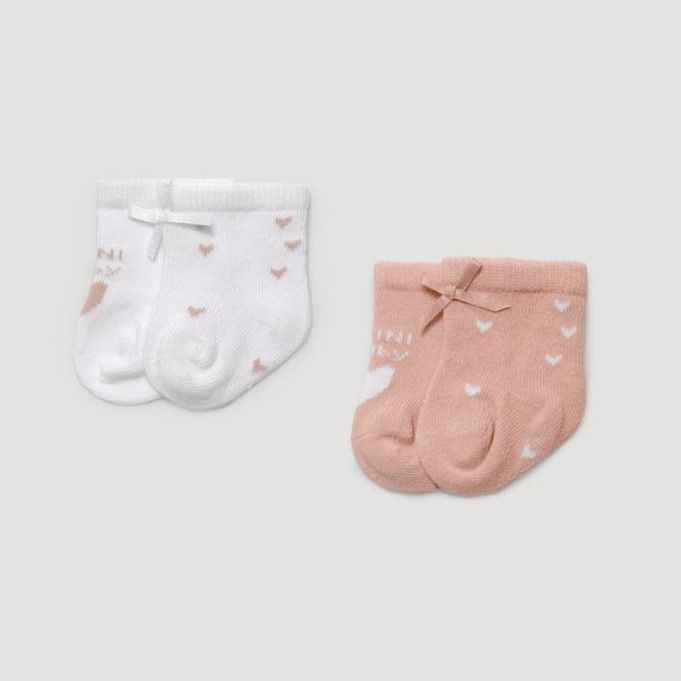 Pack de 2 calcetines para bebé tejidos en algodón. Diseños de corazones en colores suaves con puño especial antipresión. Uno de los calcetines del kit es calado. Remallados a mano.