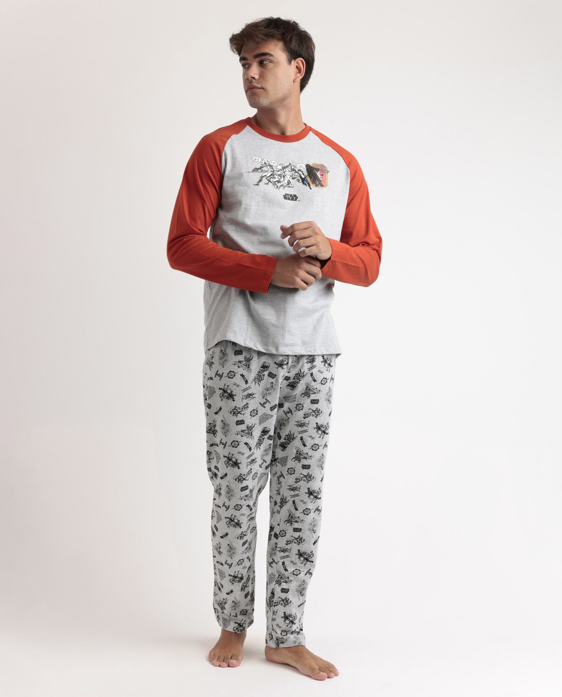 Camiseta de punto interlock 100% algodón con gran dibujo sobre la Guerra de las Galaxias de Star wars, y pantalón con bolsillos y totalmente estamapdo con las letras de Star Wars.