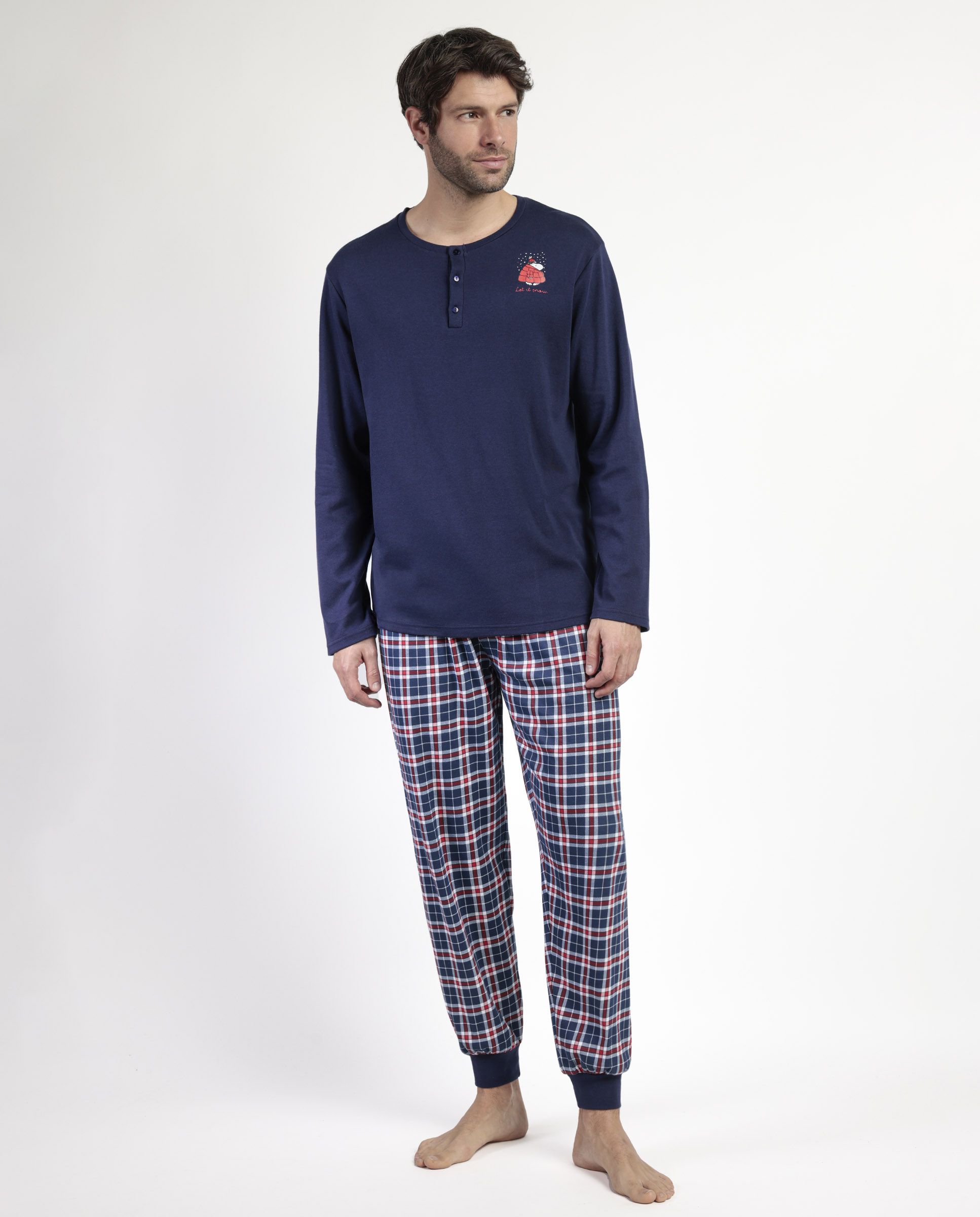 * Pijama de punto de algodón, de manga larga, cuello con tapeta con botones y pantalón largo.
