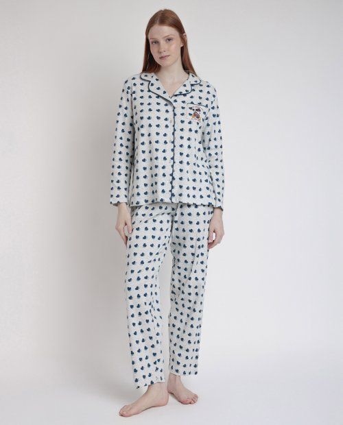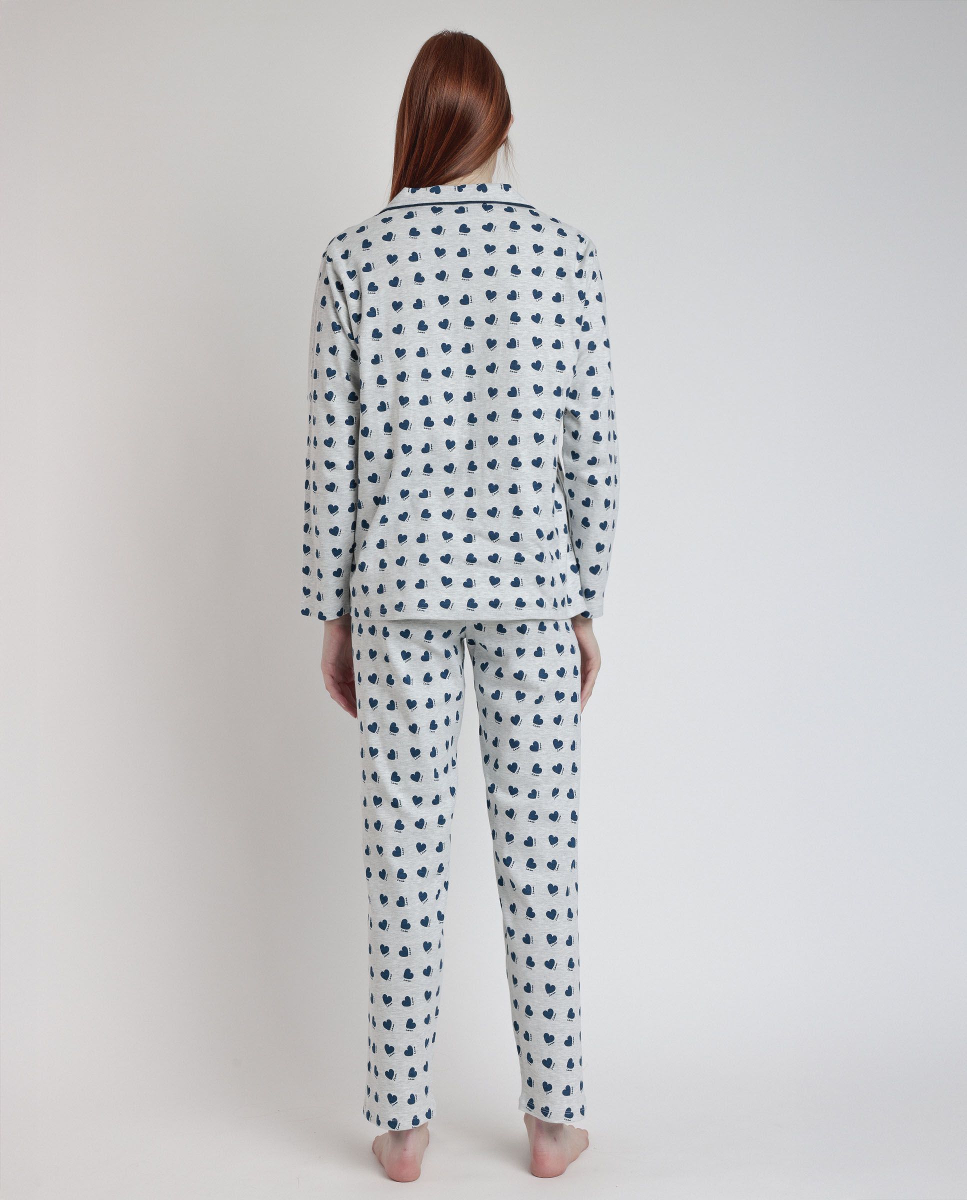 * Pijama abierto de punto de algodón, de manga larga, cuello de solapa y pantalón largo.