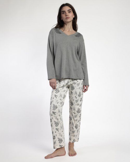 * Pijama de punto de algodón, de manga larga, cuello pico y pantalón largo.