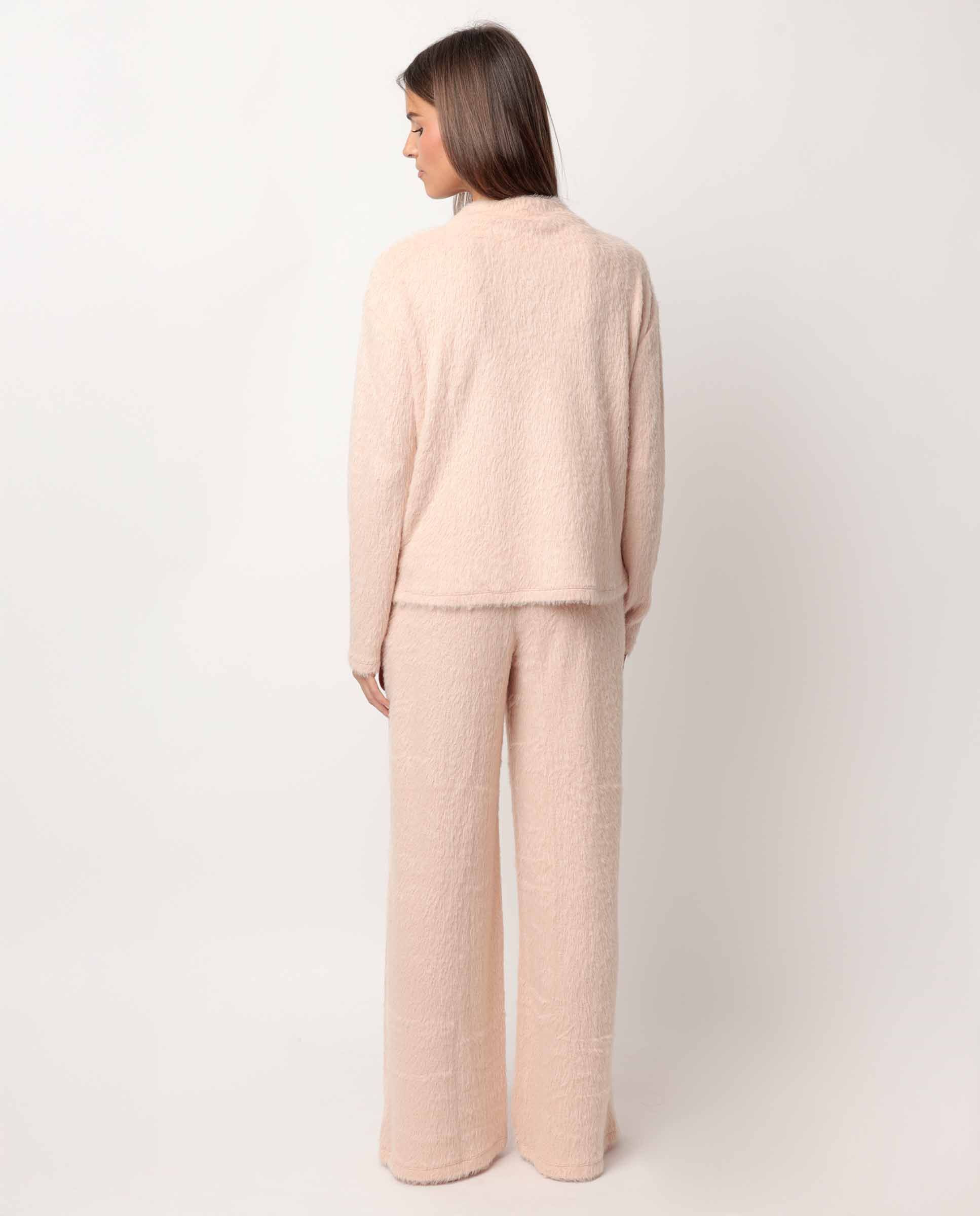 * Pijama de punto efecto pelo, de manga larga, cuello alto y pantalón largo, en dos combinaciones de color: melocotón y aqua.