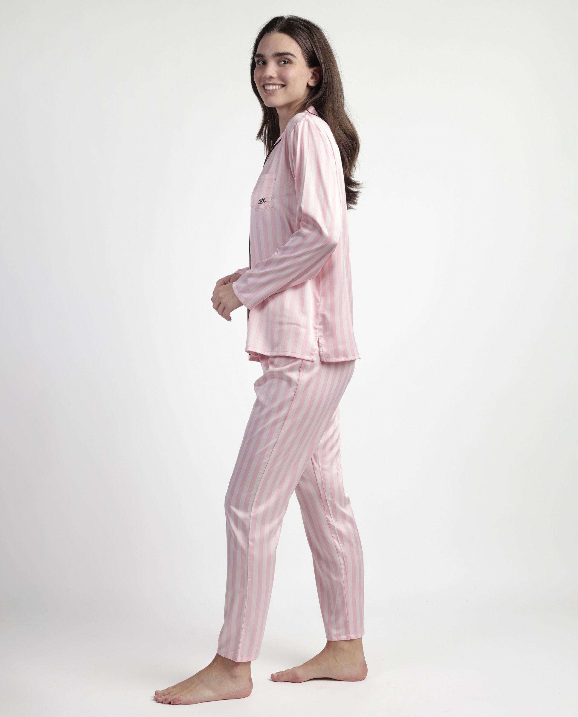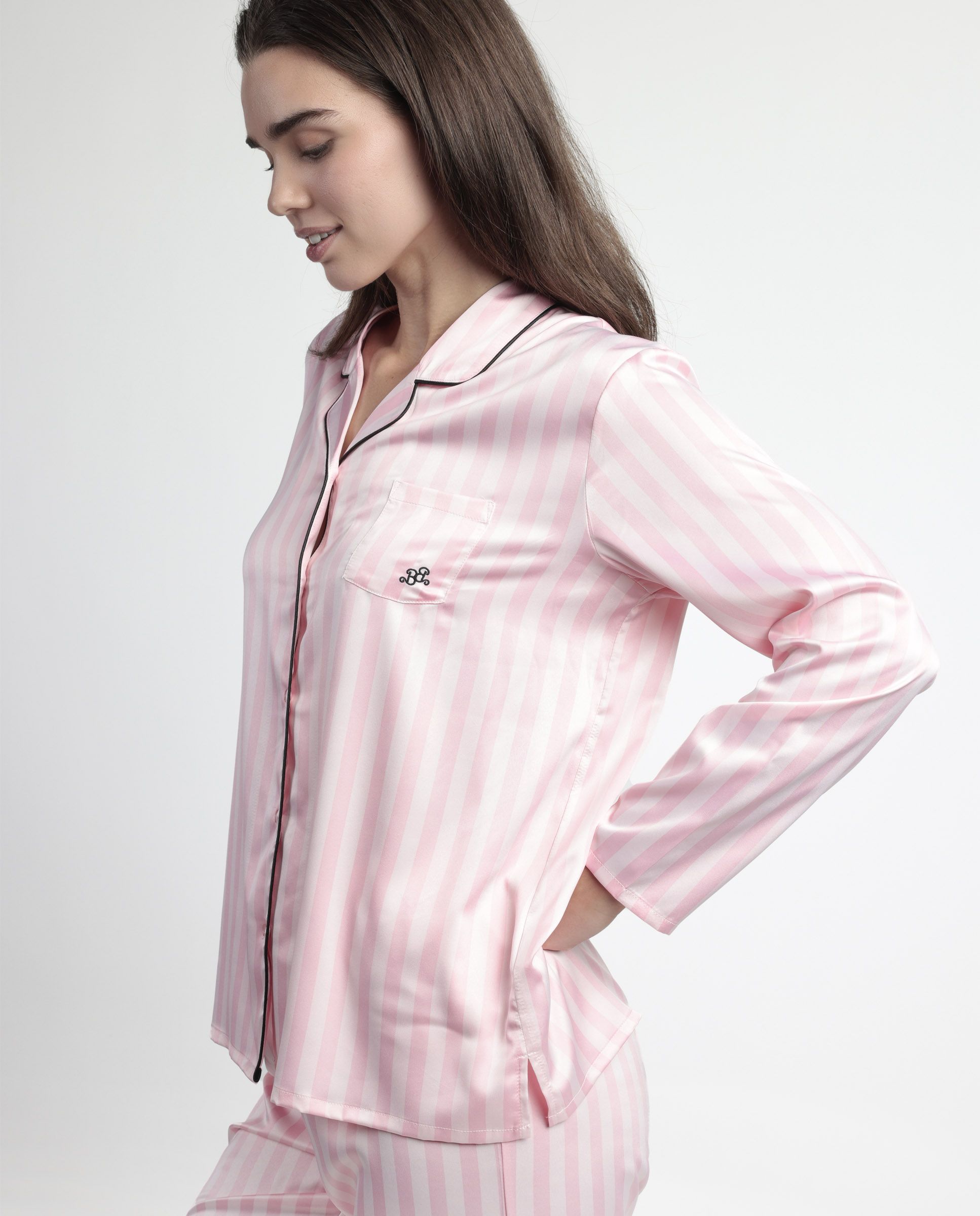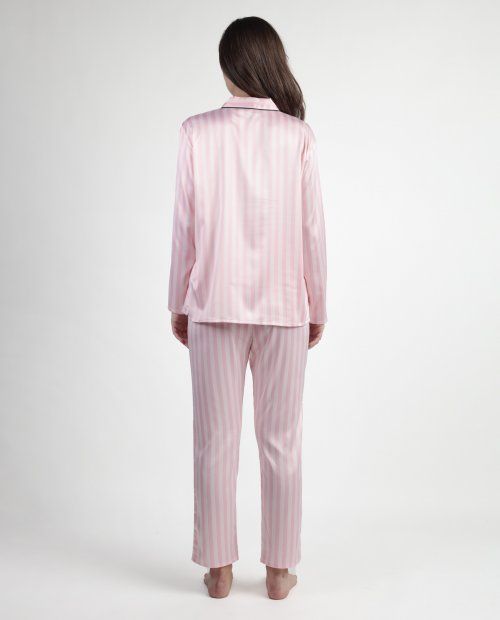 * Pijama abierto de tela satén, de manga larga, cuello de solapa y pantalón largo.