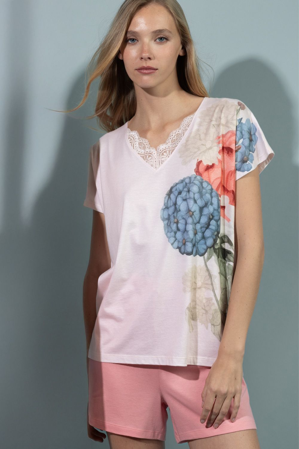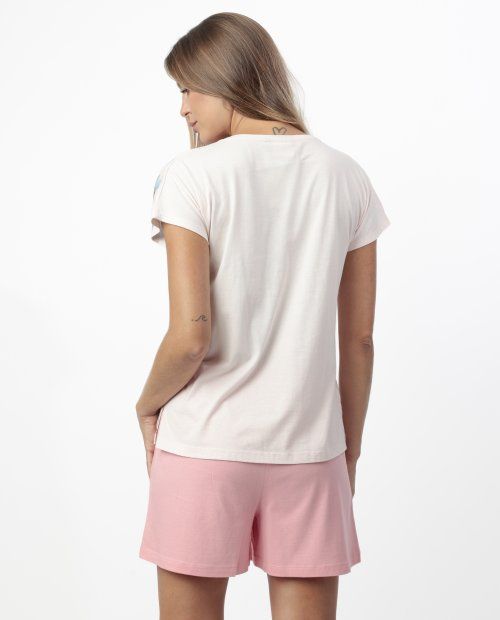 * Pijama de punto de viscosa, de manga caída, cuello pico y pantalón corto.