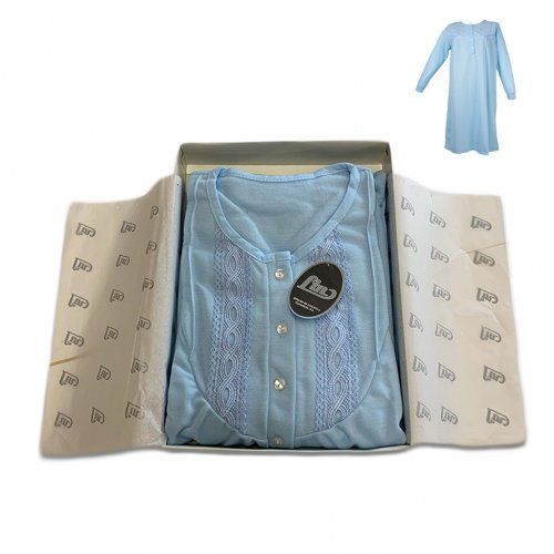 Camisón de mujer en color liso y de manga larga, tejido de algodón poliester perchado, abotonado con canesú y detalle de pequeña puntilla bordada. Presentado en caja.