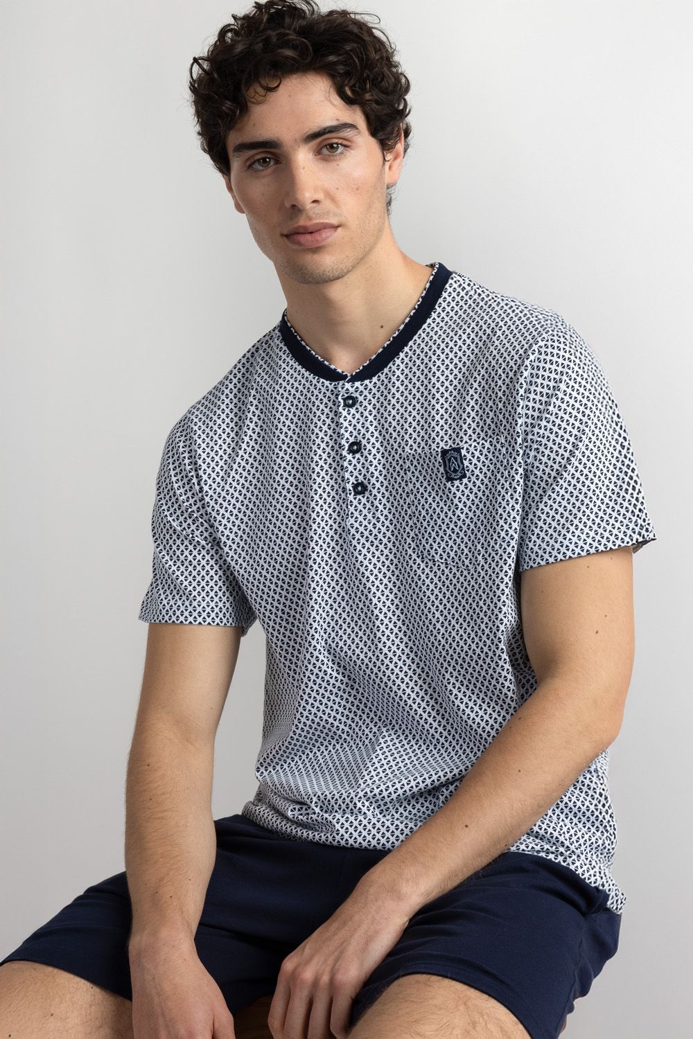 * Pijama de punto de algodón, de manga corta, cuello con tapeta con botones y pantalón corto.