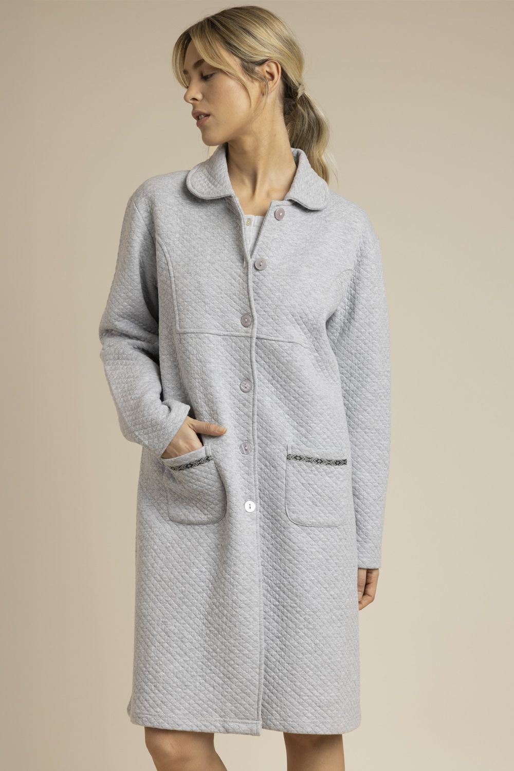 * Bata de punto de algodón, de tejido especial guateado, de manga larga, con bolsillos.