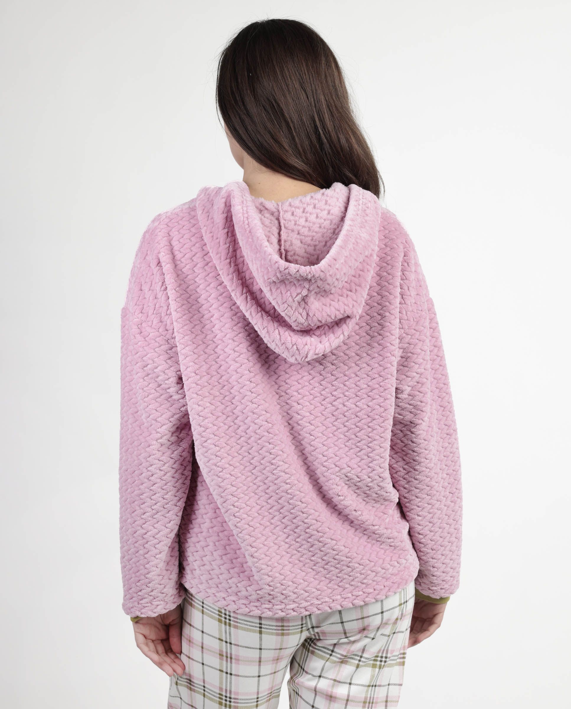 * Bata de tejido polar muy calentito, corel jacquard, de manga larga, en color rosa.