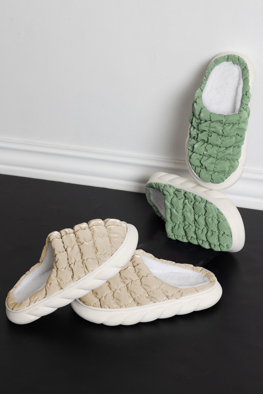 * Zapatillas de estar por casa de tejido calentito, en dos combinaciones de color: beige y verde.