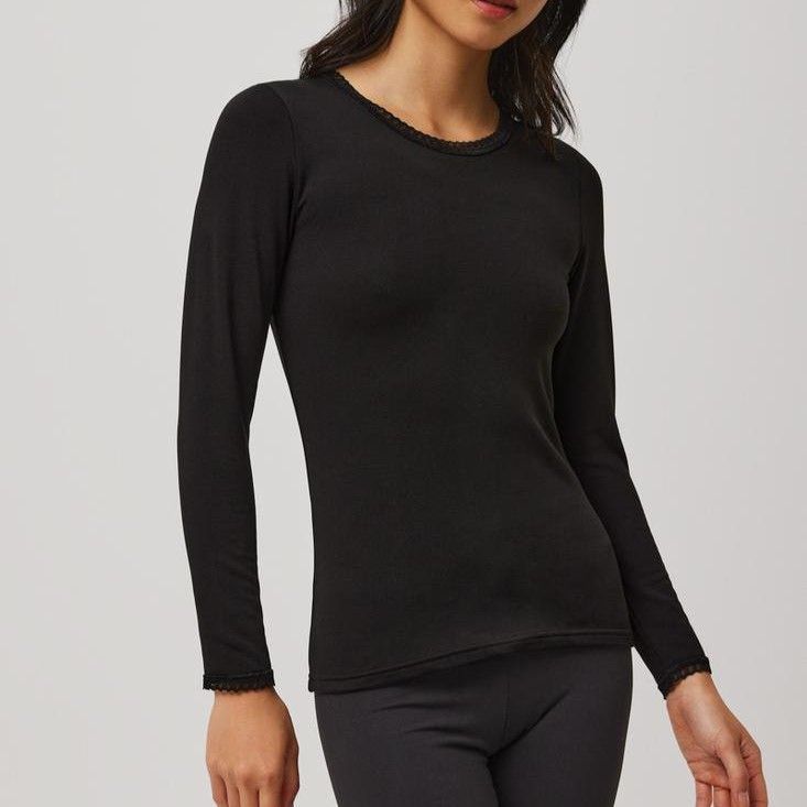 Camiseta de manga larga de cuello en pico. Con detalle de encaje en escote y puños. Confeccionada en tejido elástico, suave y de gran adaptabilidad. Detalle de encaje en el escote. Modelo básico de gran confort pensado para el día a día, es una prenda perfecta para los días más fríos y cálidos del invierno.