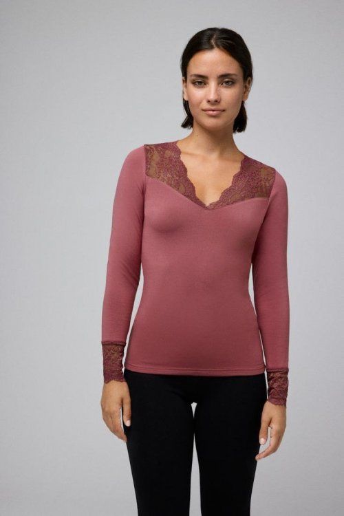 Camiseta térmica manga larga para mujer con cuello de pico. Interior afelpado y detalles de encaje.