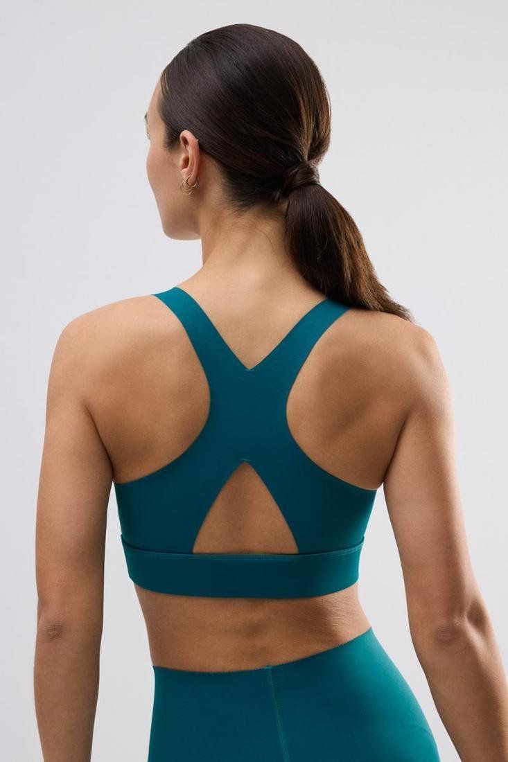 Sujetador deportivo con relleno extraíble y tejido compresivo. Con broche en la parte trasera. Detalle de pequeña abertura en la parte inferior. Combínalo con unos leggings a conjunto de la colección y completa tu look para hacer deporte.