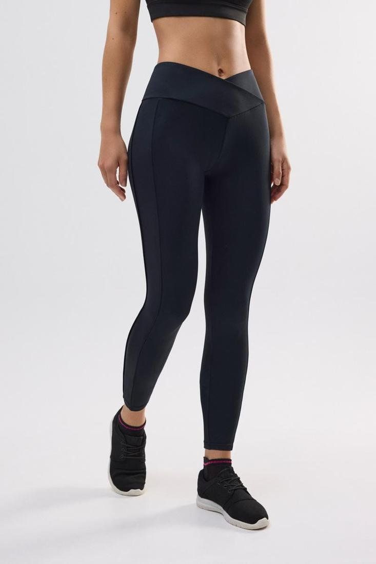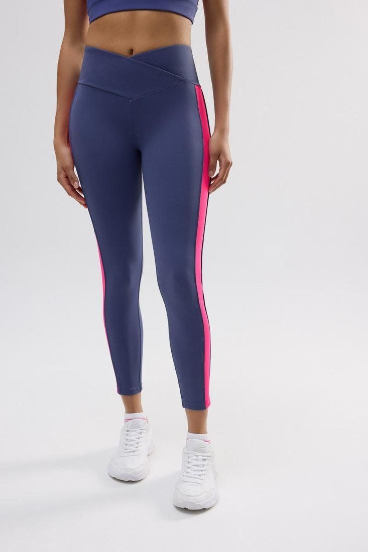Leggings deportivos largos con diseño de cintura cruzada. Diseño de franja contraste en el lateral. Contiene bolsillo trasero. Combínalos con un top a conjunto.
