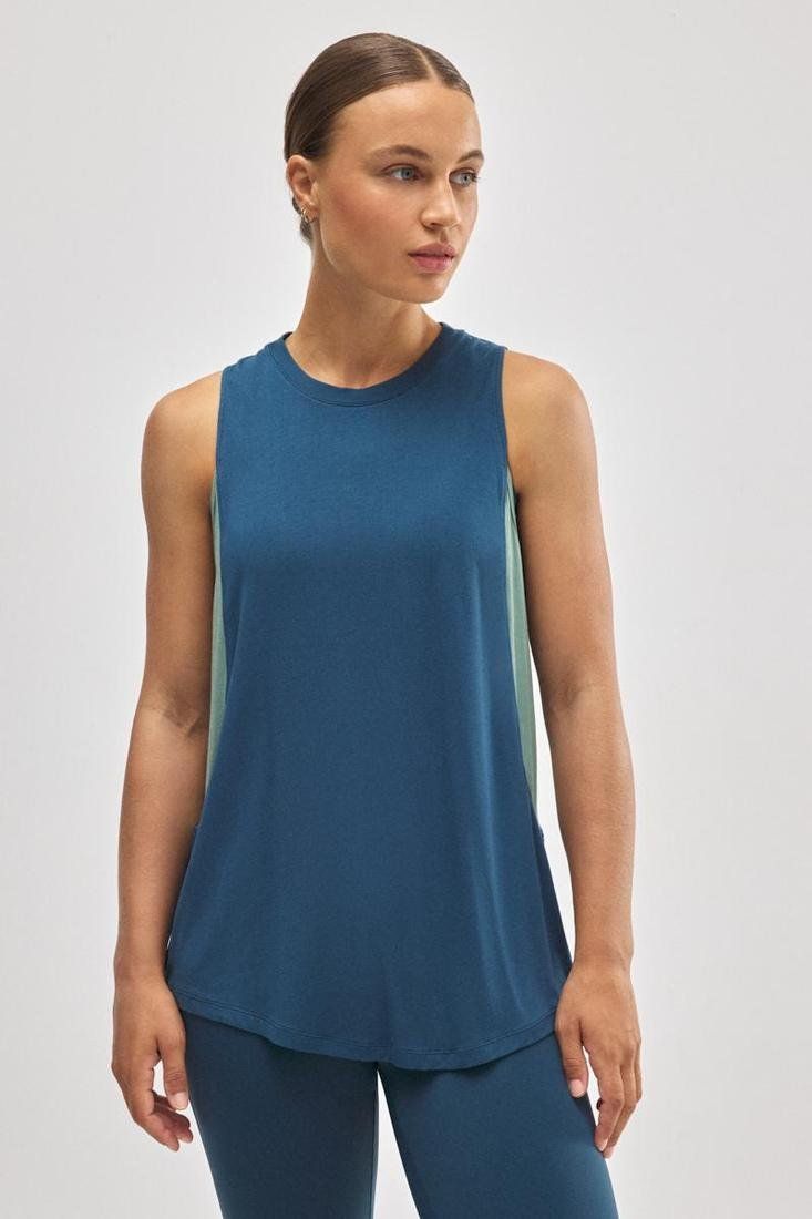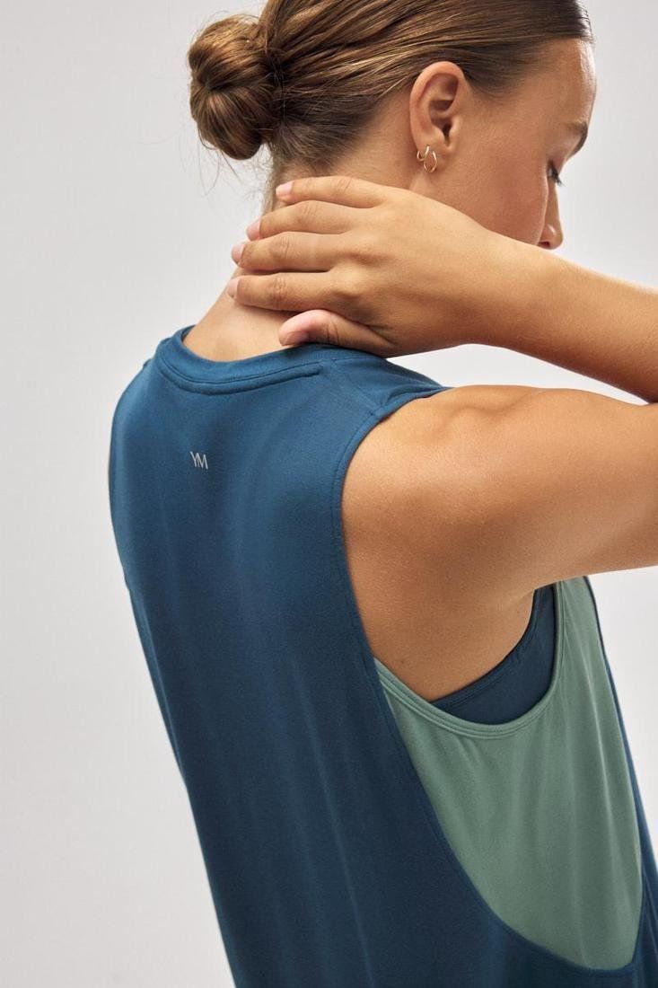 Camiseta deportiva tirantes con contraste de tejidos y colores.
