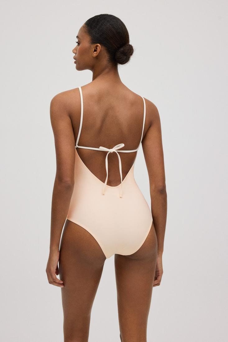 Bañador con copa B y anudado a la espalda. Detalle floral en 3D en el escote. Diseño disponible en color negro y beige.