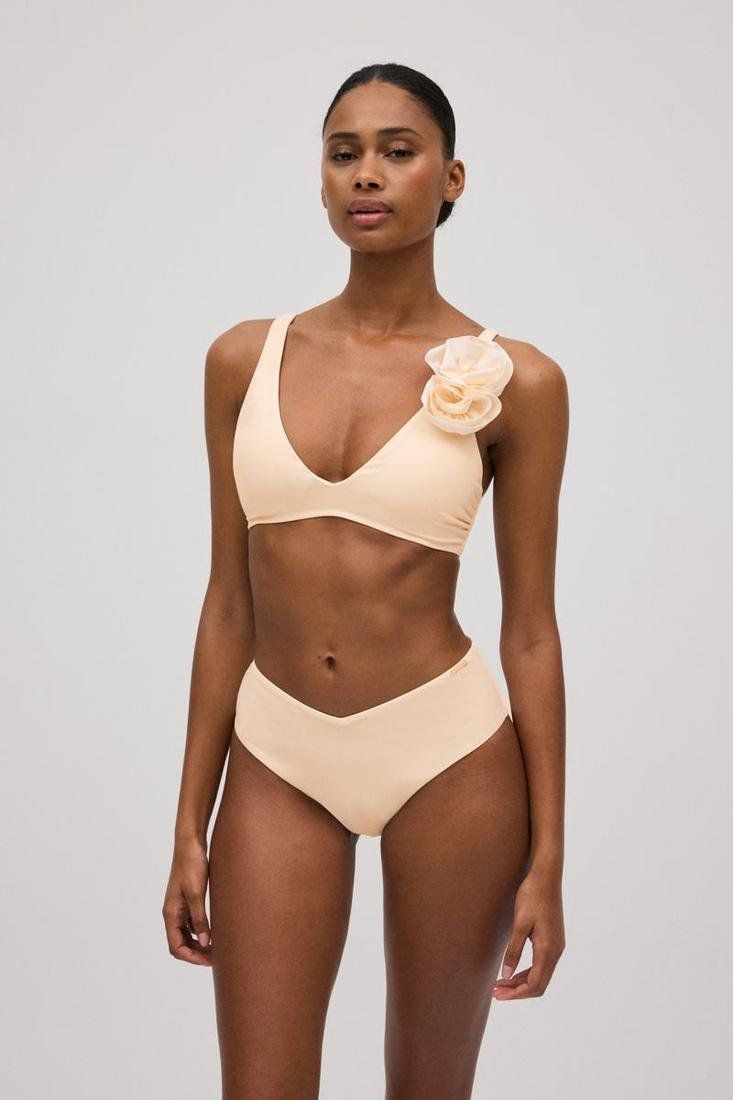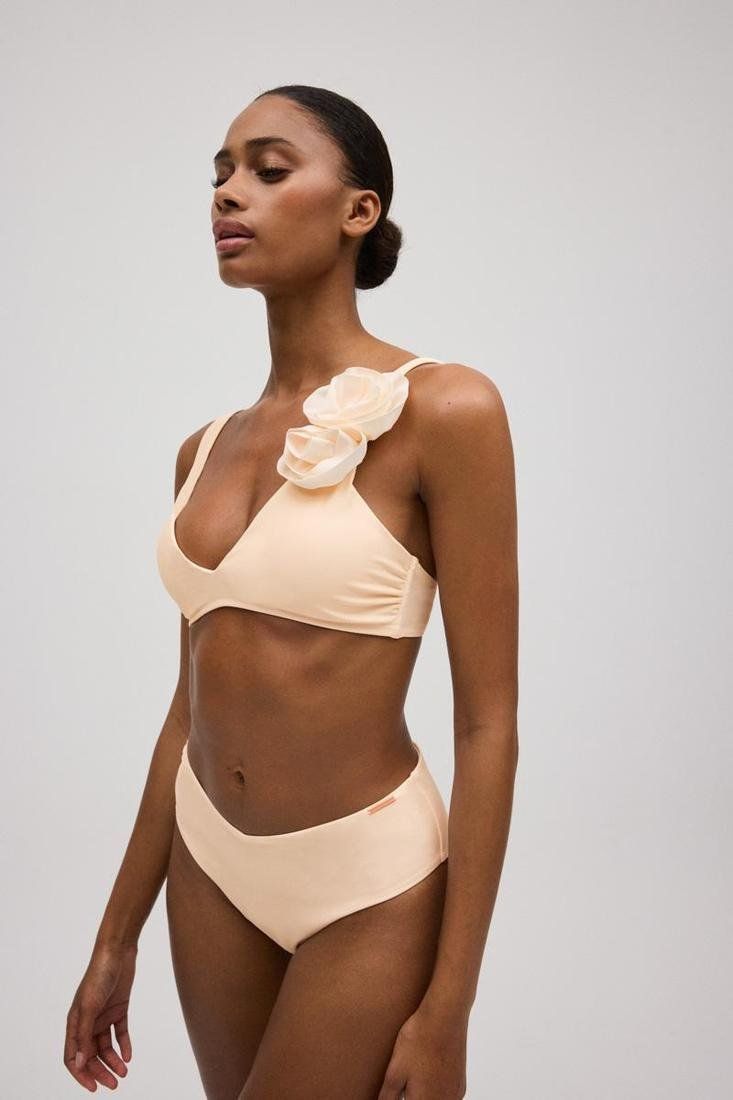 Conjunto de bikini de dos piezas. Top bikini triángulo con tirantes fijos y regulables. Detalle de flor en 3D en un tirante. Con relleno extraíble y copa B. Cierre con broche. Braguita estilo brasileña alta.