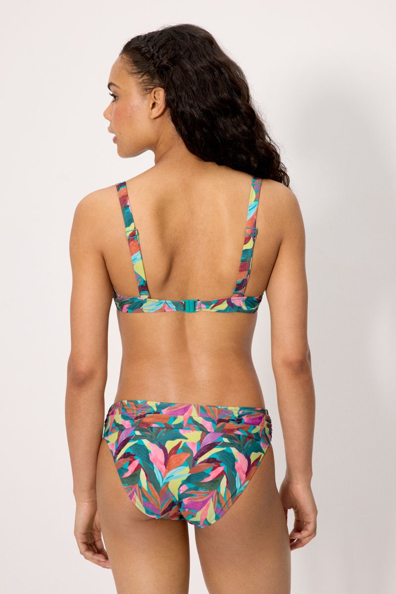Top de bikini con aro y con relleno. Tirantes fijos regulables. Estampado de hojas.
