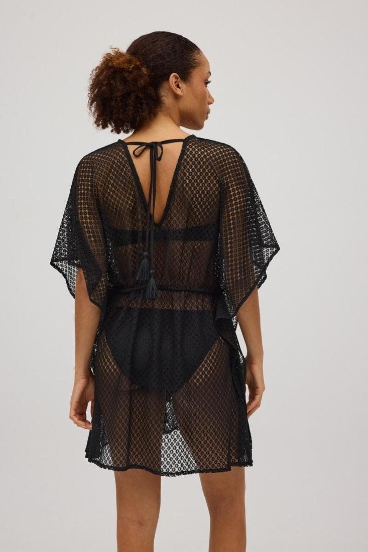 Kaftán de tejido calado con anudado en el cuello. Perfecto para días de calor aportando un toque sexy al look. El cuello en V le da un toque de elegancia. Cintura ajustada mediante un nudo para poder adaptártela a tu gusto. ¡Ideal para los días de verano!
