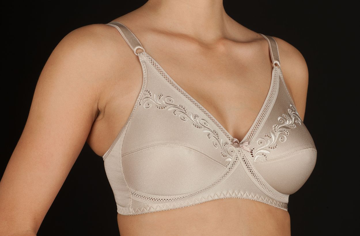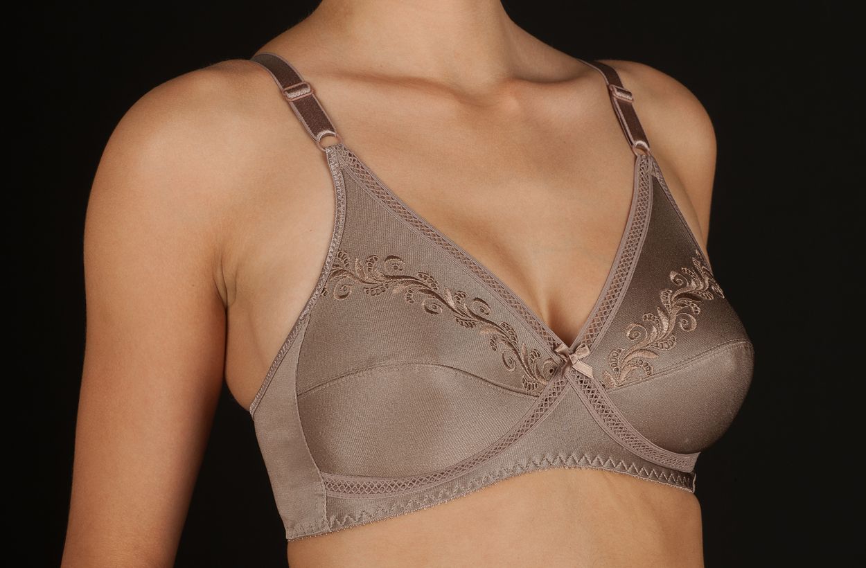Sujetador clásico sin aros, cruzado y fabricado en tejido simplex bordado.