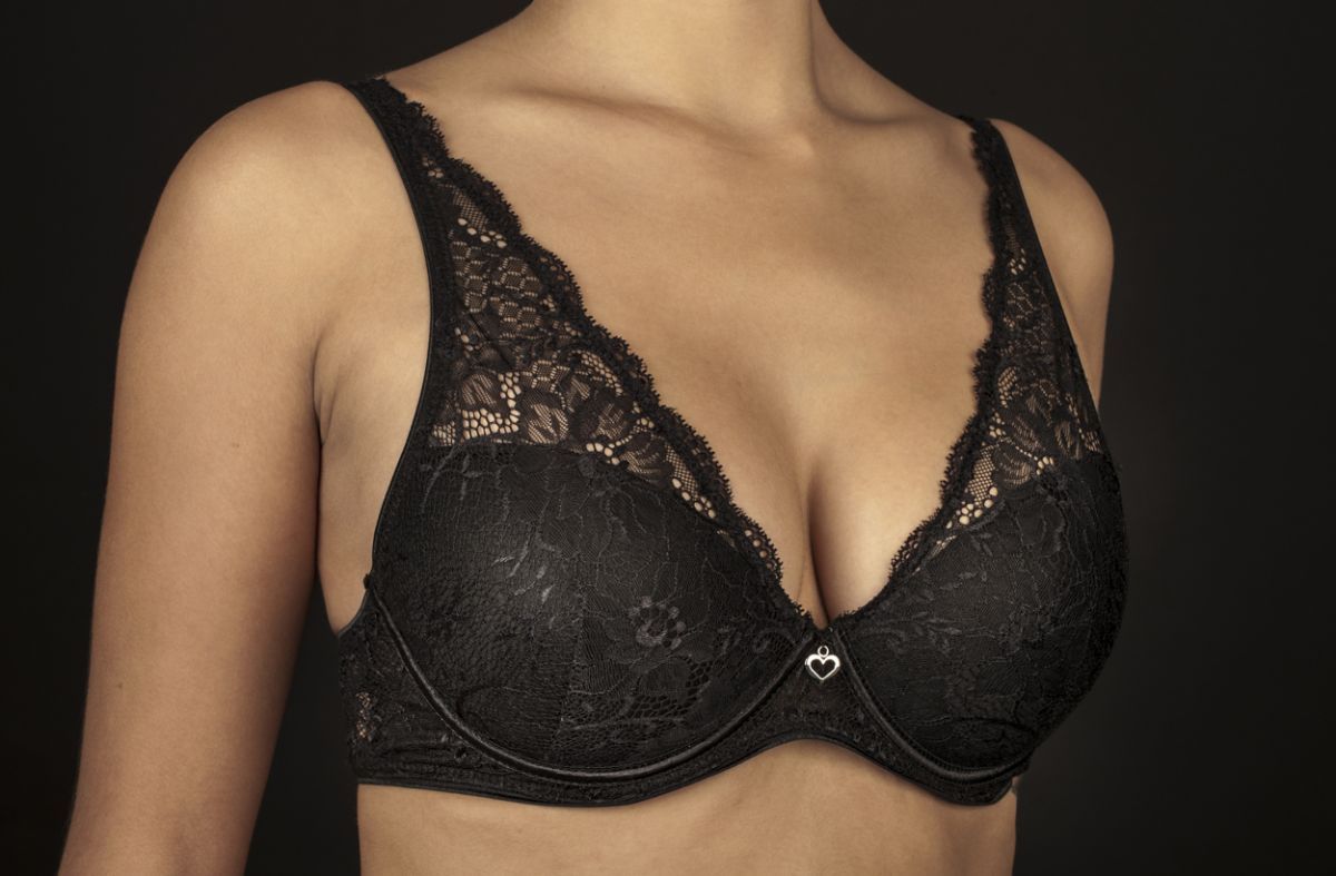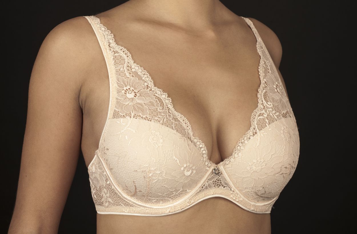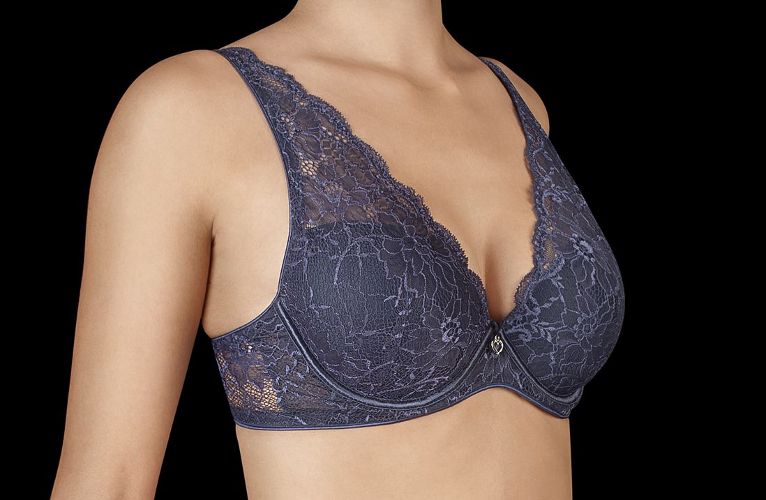 Sujetador de CREACIONES SELENE y con relleno preformado, fabricado completamente con elegante encaje e incluso por el tirante, marcado por la última tendencia de moda.