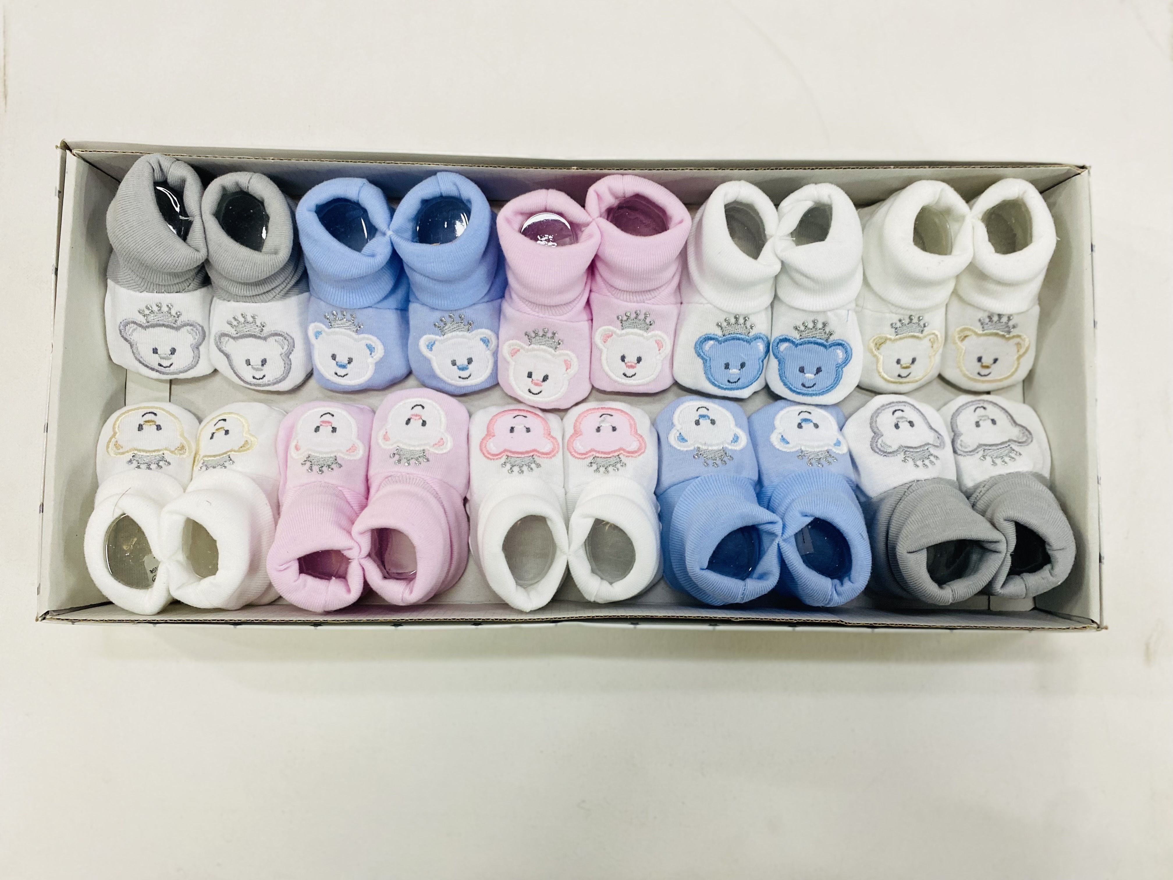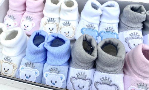 Patucos para bebe, en caja de 10 unidades.