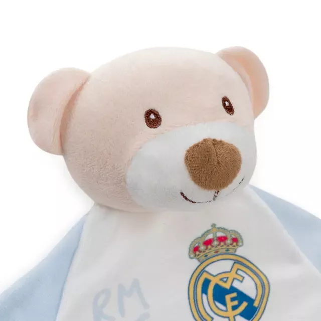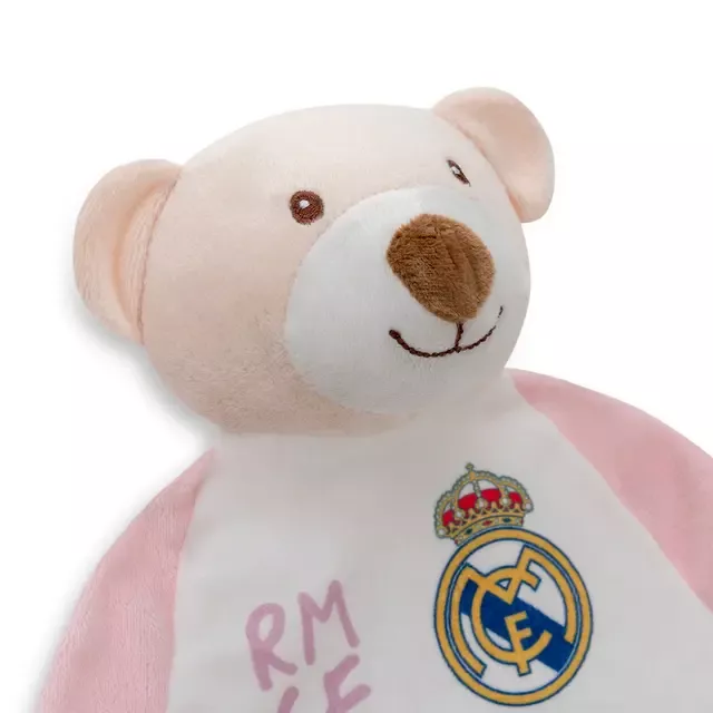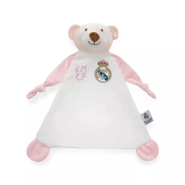 El compañero perfecto para los pequeños madridistas. Este osito doudou en color rosa del Real Madrid, se convertirá en el inseparable compañero para las noches y siestas de los futuros campeones. Fabricado con tejidos delicados y suaves para la piel de los bebés, ofrece comfort y seguridad mientras acompaña a los más pequeños desde la cuna.