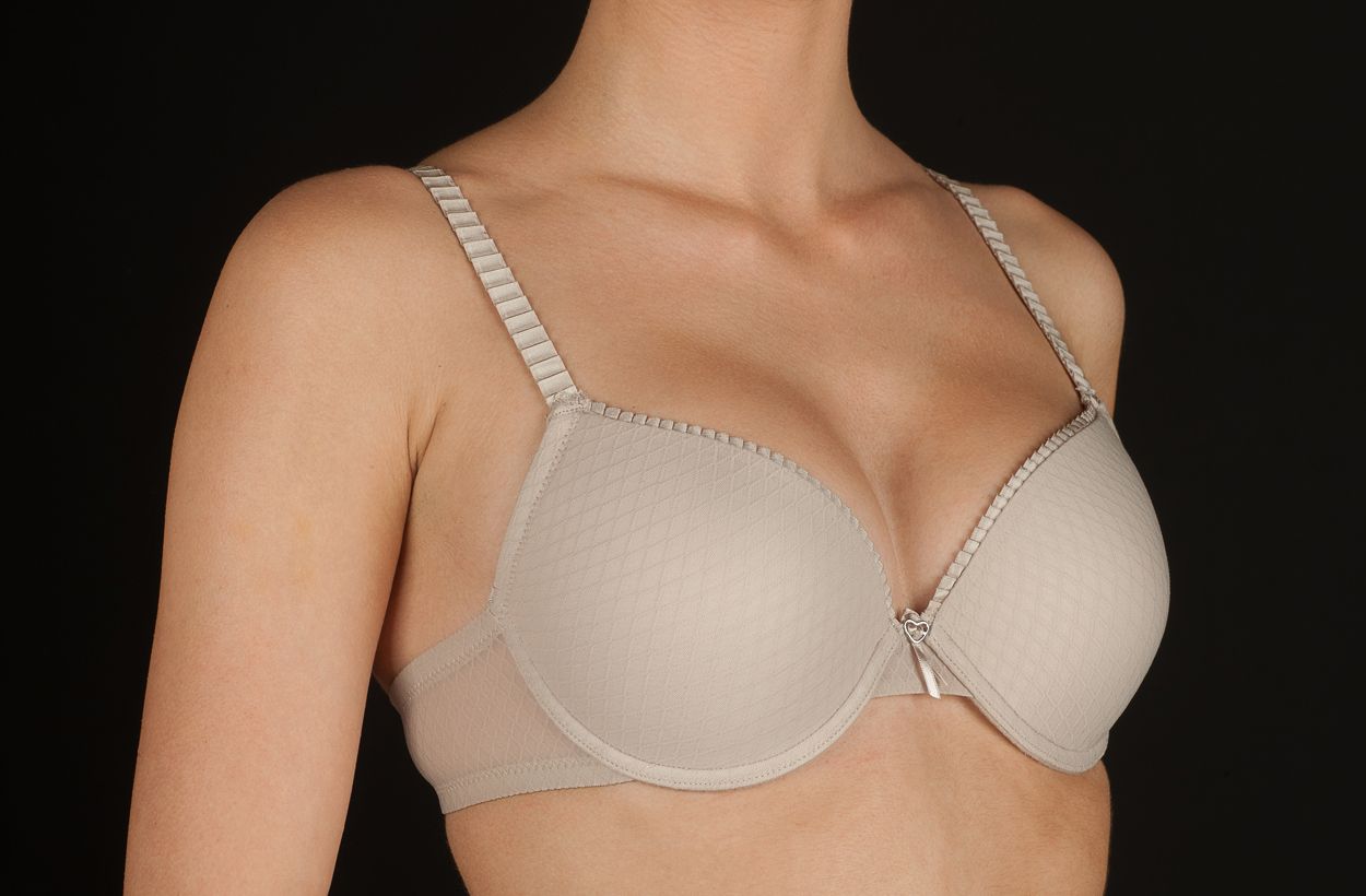 Sujetador con aros y copa de relleno push up. Fabricado con tejido elástico “nido de abejas”.