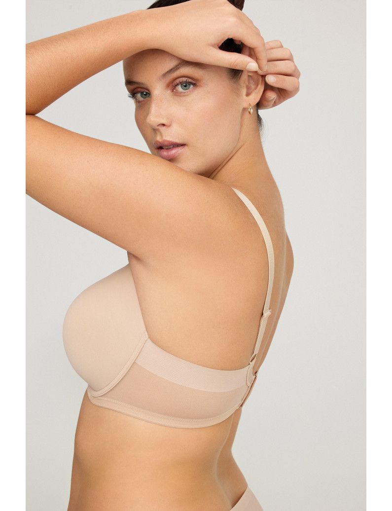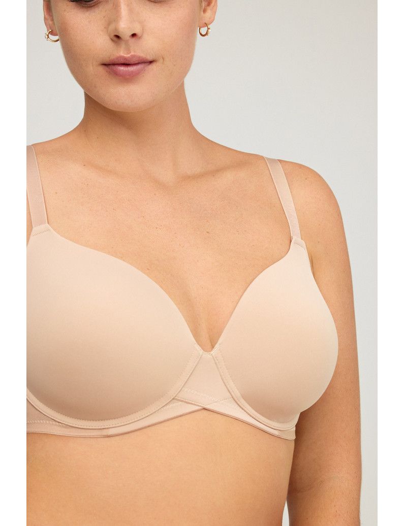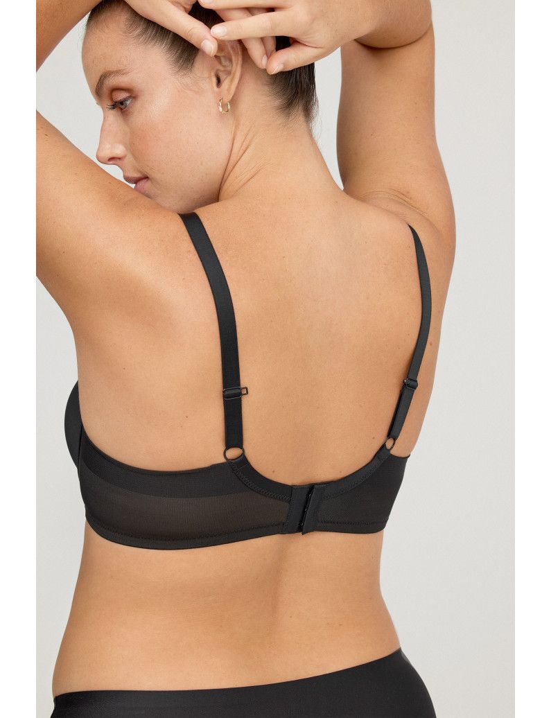 Sujetador con copa de capacidad relleno fino y aros. Laterales en tul con corte laser diseñado para cubrir y estilizar la figura. Centro pecho reforzado. Tirantes regulables y espalda ajustable. Incorpora pieza cruza tirantes